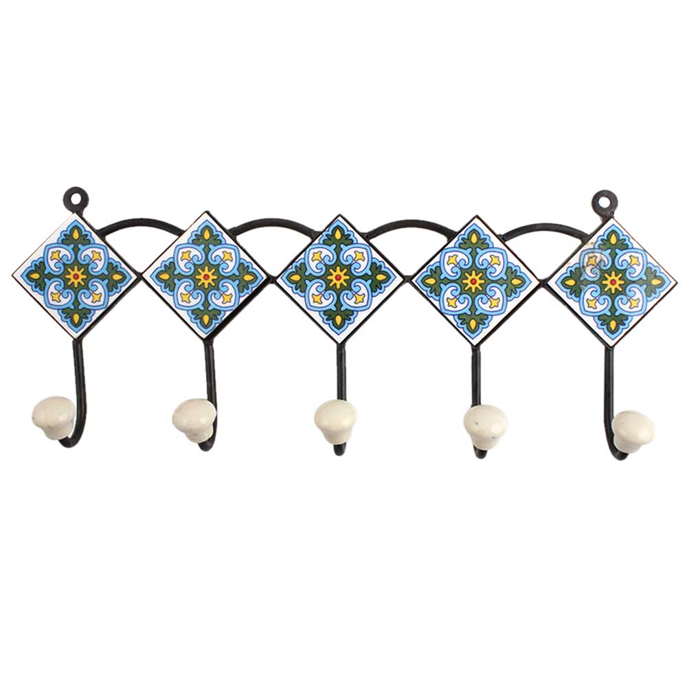 Turquoise White Floral Tiles Hook. When Put on Wall or Cabinet It is An Art in Itself. the Metal Part of This Hook is Black Powder Coated.