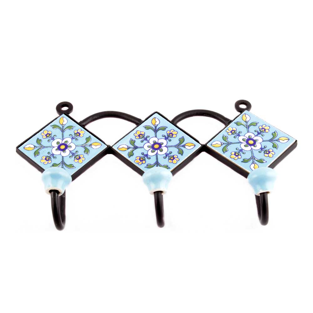 Turquoise White Tiny Flower Tiles Hooks. When Put on Wall or Cabinet it is an Art in itself. The Metal Part of this Hook is Black Powder Coated.