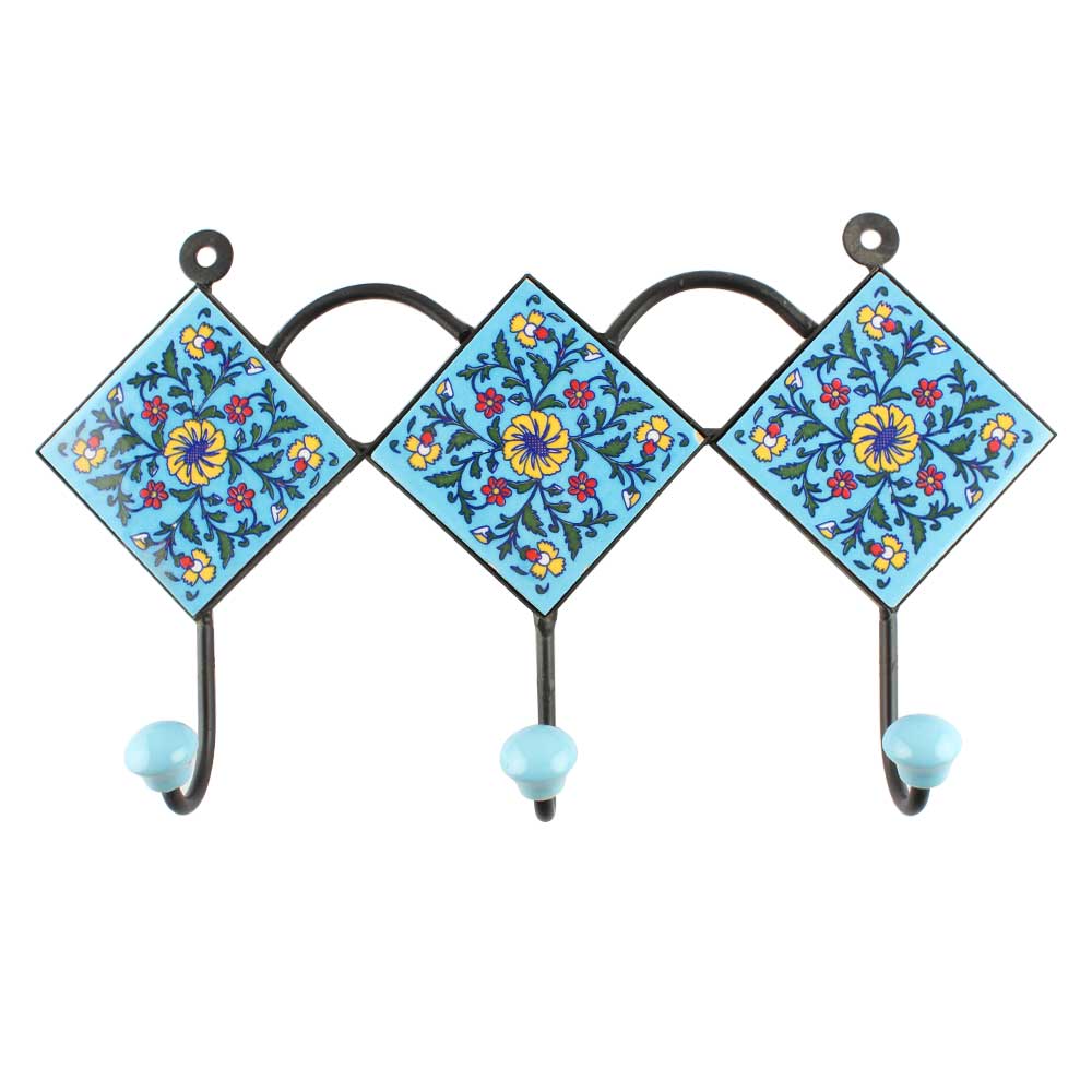 Turquoise With Yellow Wheel Flower Ceramic Tiles Hook. When Put on Wall or Cabinet It is An Art in Itself. The Metal Part of this Hook is Black Powder Coated.