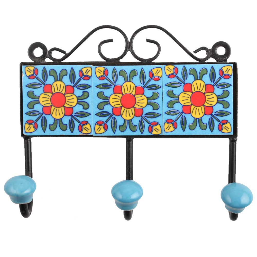 Turquoise Yellow Floral Tiles Hook. When put on wall or cabinet it is an art in itself. The metal part of this hook is black powder coated.