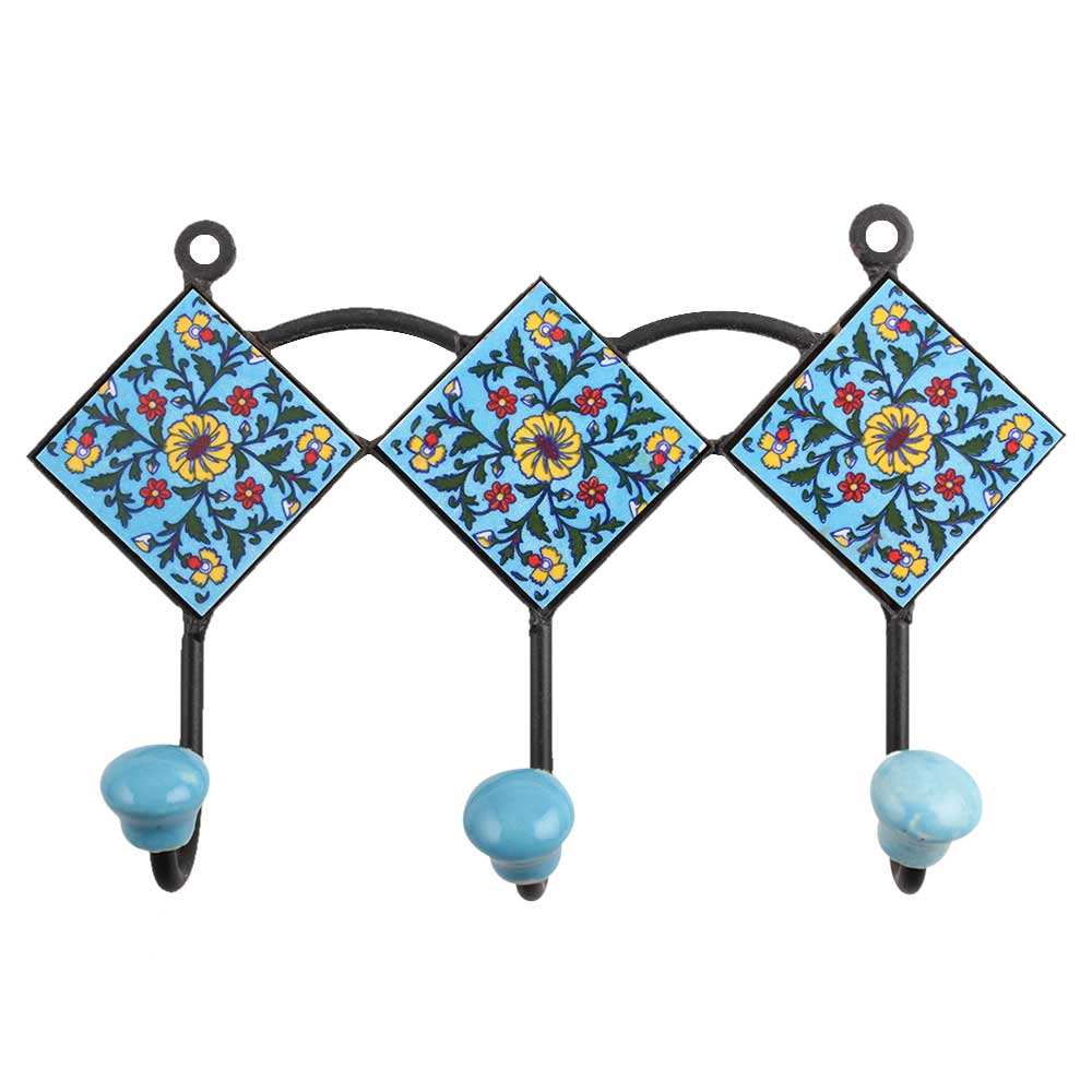 Turquoise Yellow Floral Tiles Hook. When Put on Wall or Cabinet It is An Art in Itself. the Metal Part of This Hook is Black Powder Coated.