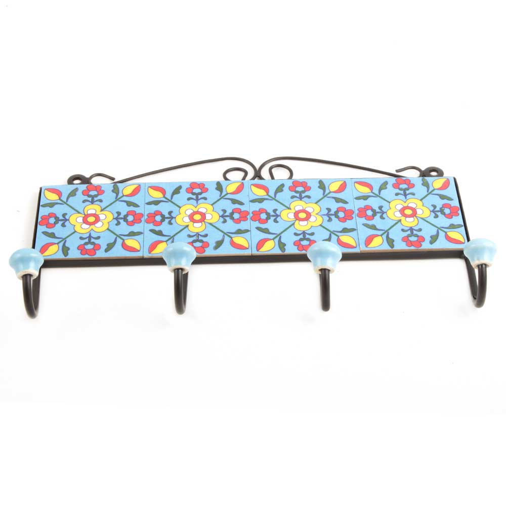 Turquoise Yellow Floral Tiles Hooks .When put on wall or cabinet it is an art in itself. The metal part of this hook is black powder coated.