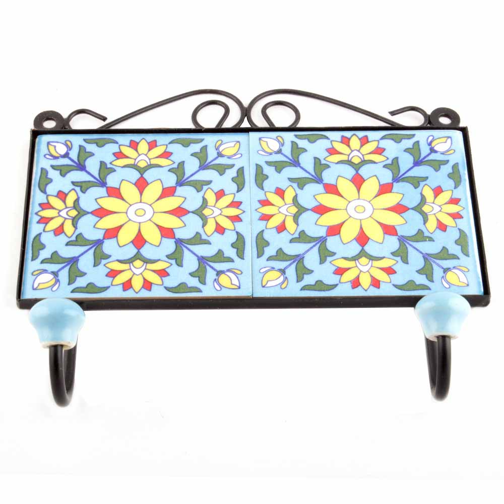 Turquoise Yellow Floral Tiles Hooks. When Put on Wall or Cabinet it is an Art in itself. The Metal Part of this Hook is Black Powder Coated.