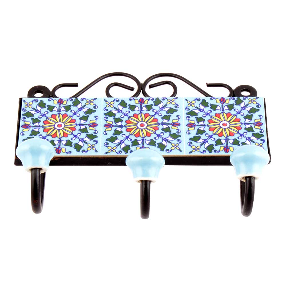 Turquoise Yellow Sunflower Tiles Hooks. When Put on Wall or Cabinet it is an Art in itself. The Metal Part of this Hook is Black Powder Coated.