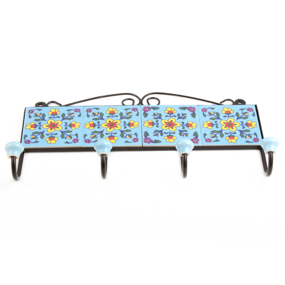 Turquoise Yellow Tiny Flower Tiles Hooks .When put on wall or cabinet it is an art in itself. The metal part of this hook is black powder coated.