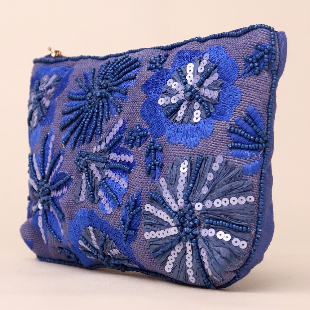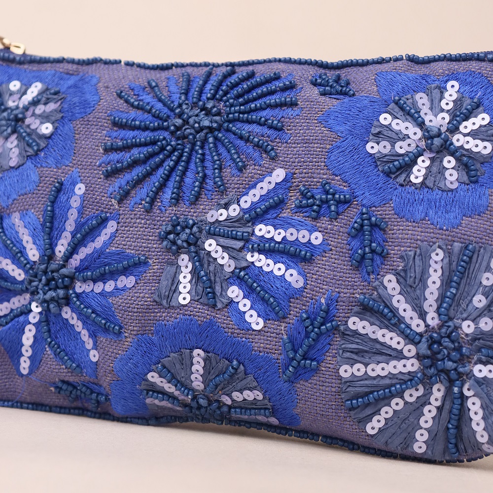 Celebrate the allure of handcrafted elegance with this richly embroidered pouch featuring vibrant floral motifs in shades of midnight and electric blue. Embellished with sequins and threadwork, the pouch captures the beauty of a starry evening garden. Lightweight and compact, it's ideal for storing your essentials in style—whether you’re stepping out for brunch or heading to an evening soirée.