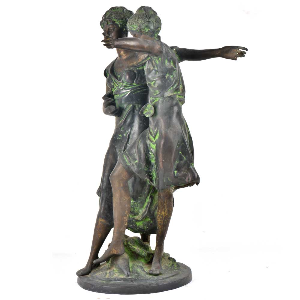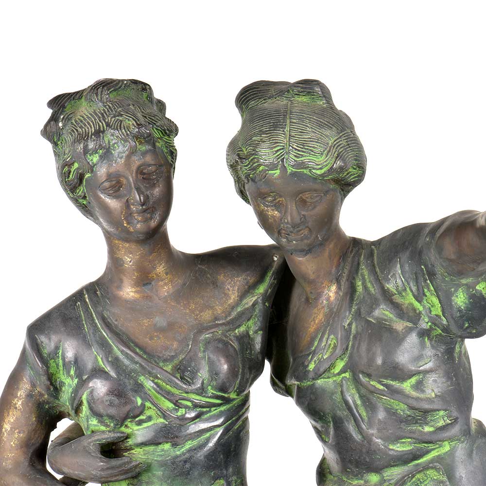Presenting a lovely handmade Brass figurine of two dancing ladies wearing ordinary clothes with a smile on their faces . They seem to enjoy their dance and we an see the other lady is trying to teach her friend or sister to dance .The brass statue is fixed on a metal base and will look elegant in your display unit or the living room .Can also be gifted to your friemds or relatives.