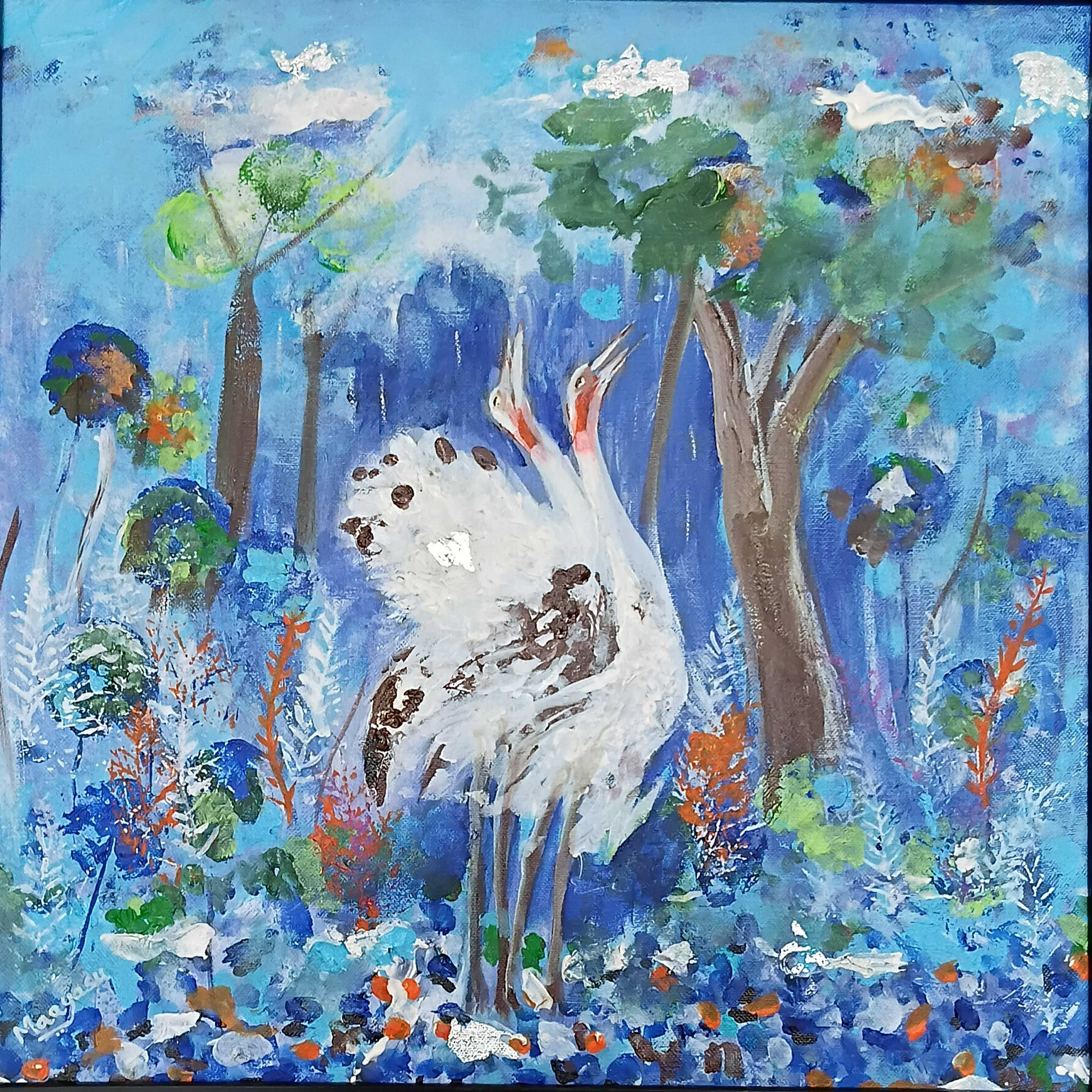 The Red-crowned crane, also known as the Manchurian crane, is a magnificent species native to East Asia and is among the rarest of the crane family. These majestic birds showcase a striking white body adorned with elegant black feathers on their necks and tails, crowned by a vibrant scarlet patch that adds to their allure. Revered as symbols of luck, longevity, and fidelity, these cranes evoke a sense of wonder and reverence in many cultures. In the captivating painting before us, two of these enchanting cranes are depicted dancing joyfully in the rain—a scene that radiates exuberance and positivity. The delicate interplay of colors and the graceful movements of the cranes not only capture their splendor but also embody the essence of happiness and vitality. This artwork serves as an exquisite addition to any space, infusing homes, offices, malls, and bedrooms with its uplifting energy and serene beauty. The painting has a stylish black frame.