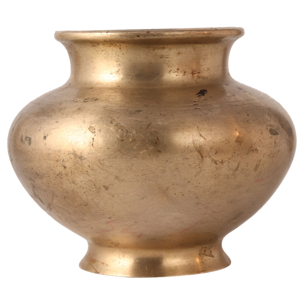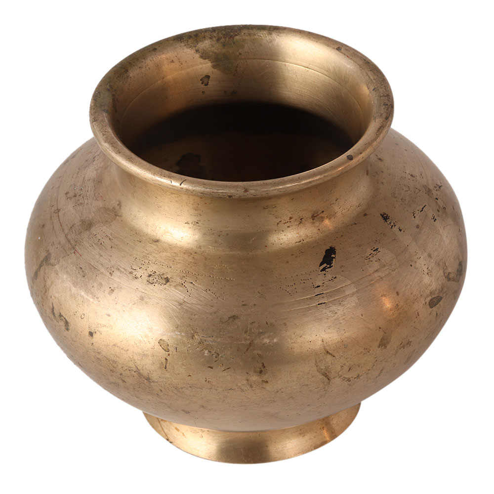 This Indian style holy water pot is made by local artisans in India. It is used at Indian weddings and Puja to hold holy water, rice and other items. It is made of bell metal alloy. It is a good choice for collectors.