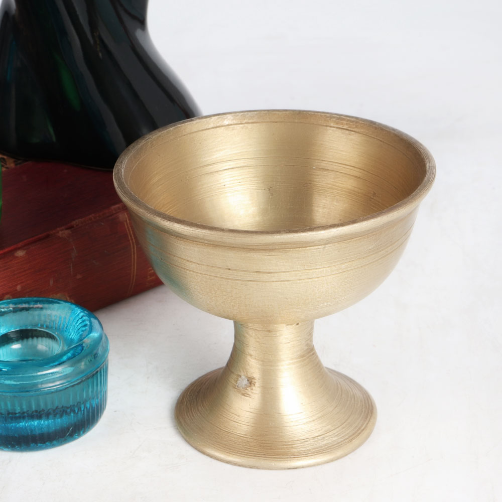 Give your interior a seductive look by placing this exquisite decorative piece on the table or shelf. It has a golden finish and a stand to keep it on the surface. Brass cups have been used since ancient times during havans, rituals and auspicious functions. They are used to store milk or holy water. Place this incredible piece in the eastern or northern direction of your home and it will spread positive energy in the surrounding. It is handcrafted by highly skilled and experienced Indian artisans from South India and is made of high quality brass, which gives the decoration a long lasting impression. A wonderful gift on special, festive and auspicious occasions for your family, friends and relatives.