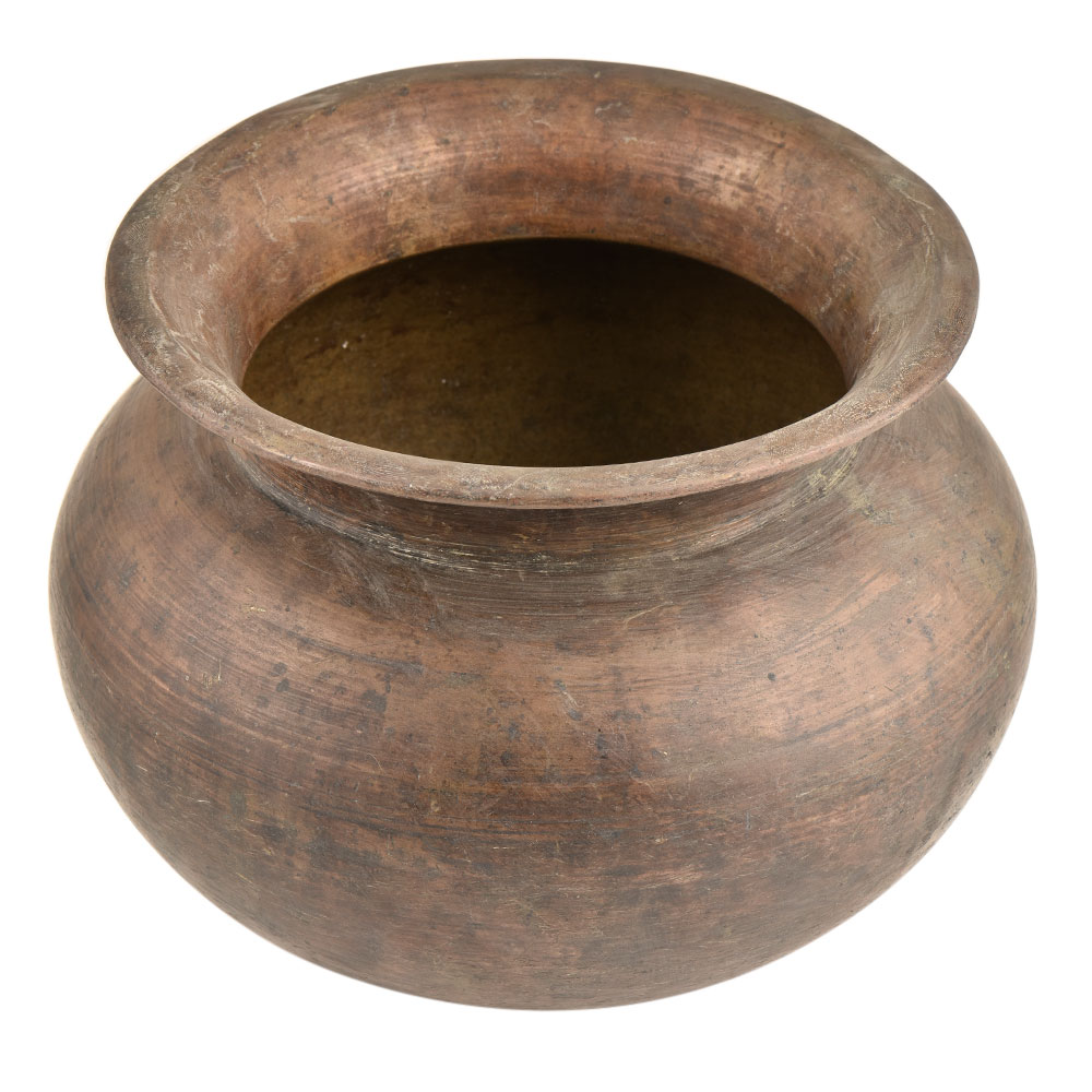 This is a rather unique shaped lota or pot with rough and uneven tribal carvings on the surface a protuding rim or neck with a small mouth . The pot would make a lovely shelf ornament flower pot or table display.