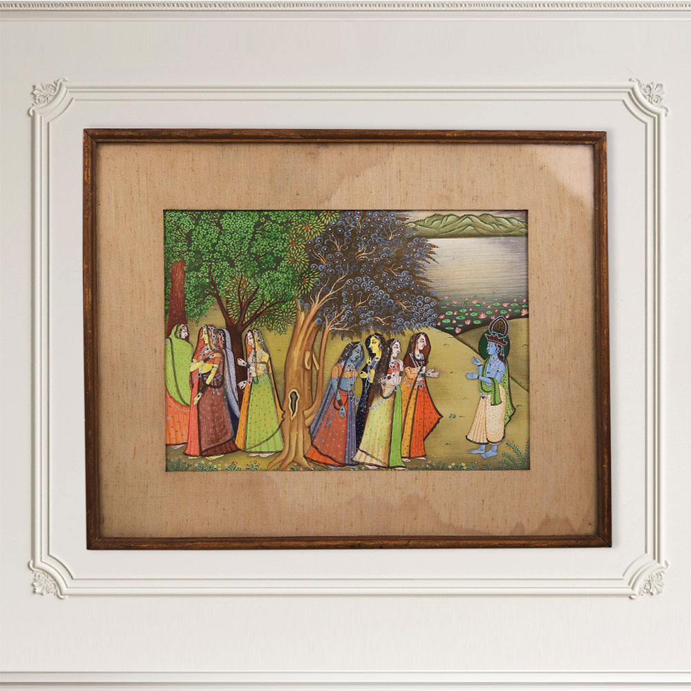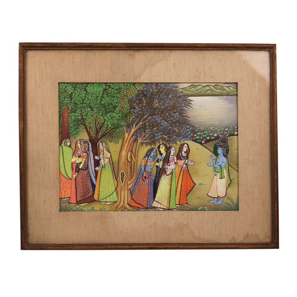 Escape to the enchanting realm of Hindu mythology with this breathtaking used paper painting. Masterfully crafted by skilled artists from the Himalayan region, this piece celebrates the timeless beauty and cultural richness of this sacred landscape. The aged, textured paper lends an air of authenticity and history to the painting, making it a truly special addition to any art collection or home decor. Immerse yourself in the vibrant colors, intricate details, and spiritual energy that emanate from every brushstroke as Lord Krishna and his beloved Gopies dance across the canvas. Whether you're a seasoned art enthusiast or simply seeking to infuse your space with a touch of cultural elegance, this painting is a must-have. It's a unique, one-of-a-kind piece that will transport you to the enchanting world of the Himalayas, evoking a sense of wonder, spirituality, and deep connection to the timeless wisdom of this remarkable region. Elevate your living space and surround yourself with the captivating beauty and magic of the Himalayas. This painting is a true masterpiece that will captivate and inspire you for years to come, allowing you to immerse yourself in the rich cultural heritage of northern India.