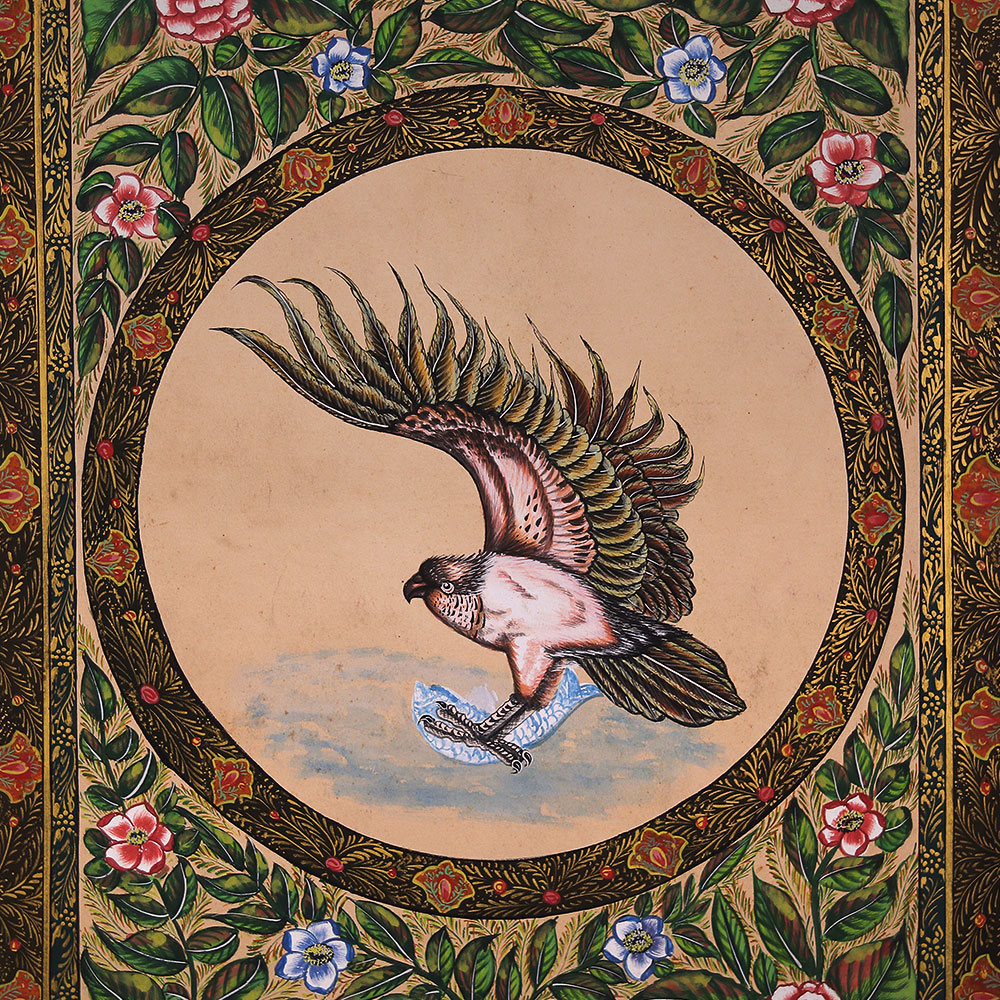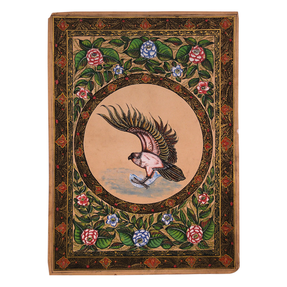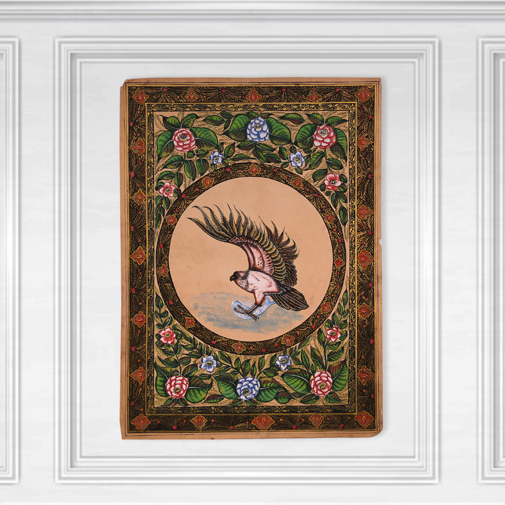 Soar to new heights of style and sophistication with this exquisite used water color painting of a majestic eagle. Rendered in vivid hues on premium fine art paper, the eagle's every feather and talon is brought to life in striking detail, while the decorative border adds an elegant, refined touch. This one-of-a-kind artwork is the perfect blend of natural beauty and artistic flair, elevating any space with its captivating presence. Whether you're looking to enhance your living room, home office, or any other space, this painting is a must-have. Its majestic eagle subject and refined, ornate border design will inspire awe and admiration in all who behold it. Bring the beauty of nature and the sophistication of fine art together in one stunning piece that will elevate your décor to new heights.