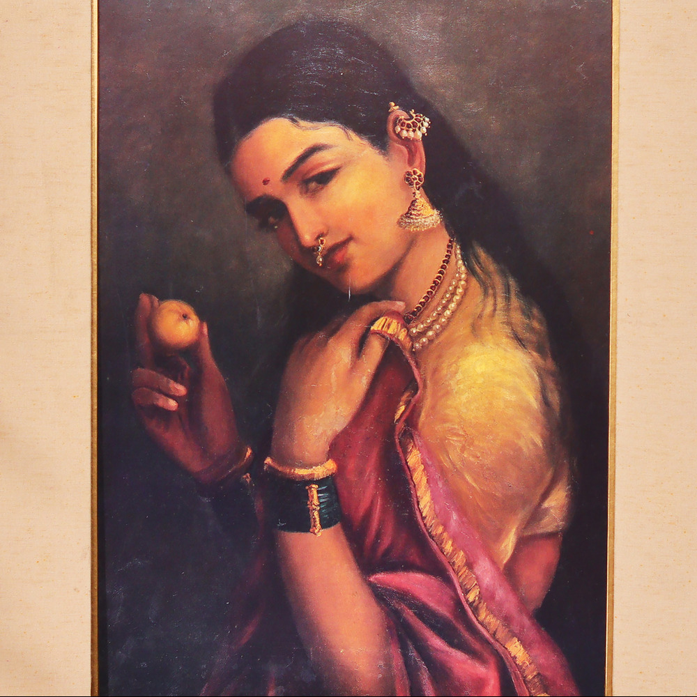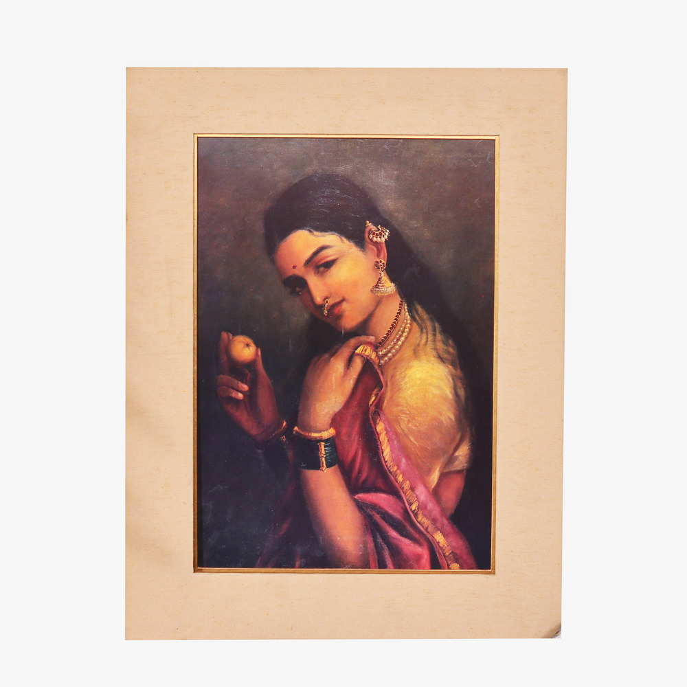 Discover the timeless allure of this used print by the legendary Indian artist Raja Ravi Verma, featuring a captivating woman holding a luscious fruit in her hand. Renowned as the "Father of Indian Art," Verma's unparalleled talent for capturing the beauty and essence of the human form is on full display in this exquisite work. This used print offers a glimpse into Verma's artistic mastery, transporting you to a world of refined sophistication and timeless elegance. The woman's captivating gaze and the ripe, succulent fruit she holds create a sense of tranquility and sensuality that is simply mesmerizing. Hang this piece in your home or office to infuse the space with a touch of timeless beauty and artistic brilliance. Whether you're an art enthusiast or simply appreciate the beauty of the human form, this used print by Raja Ravi Verma is a true treasure that will captivate your senses and elevate your space. Invest in a piece of history and let this masterful work of art inspire and delight you for years to come.