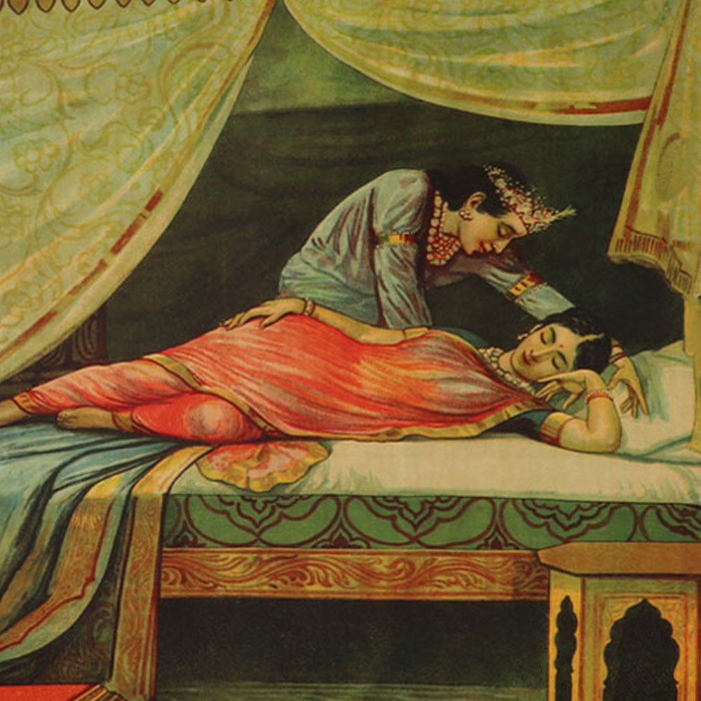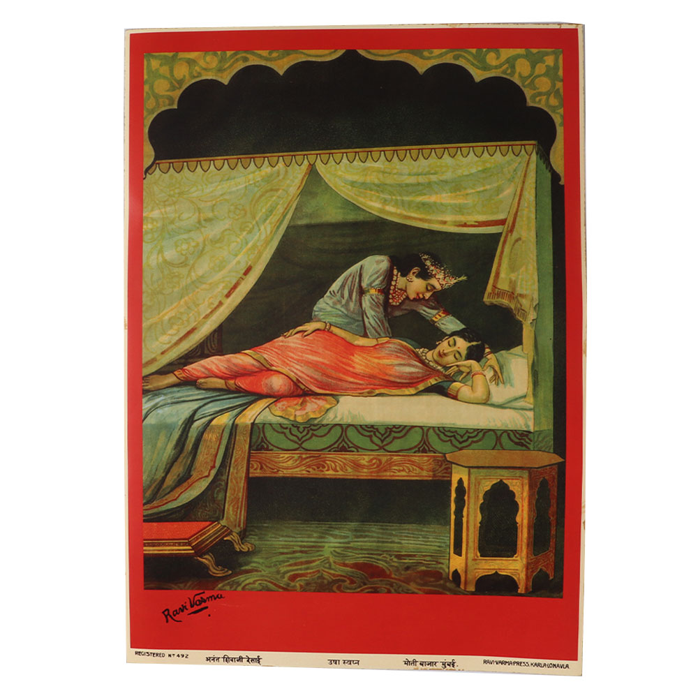 The Usha Swapna print depicts the mythical story of Usha, the daughter of the demon king Banasura, and her dream vision of the god Krishna. In this artwork, Usha is shown in a serene and almost divine form, symbolizing beauty, grace, and divine interaction, a common theme in Raja Ravi Varma’s works.