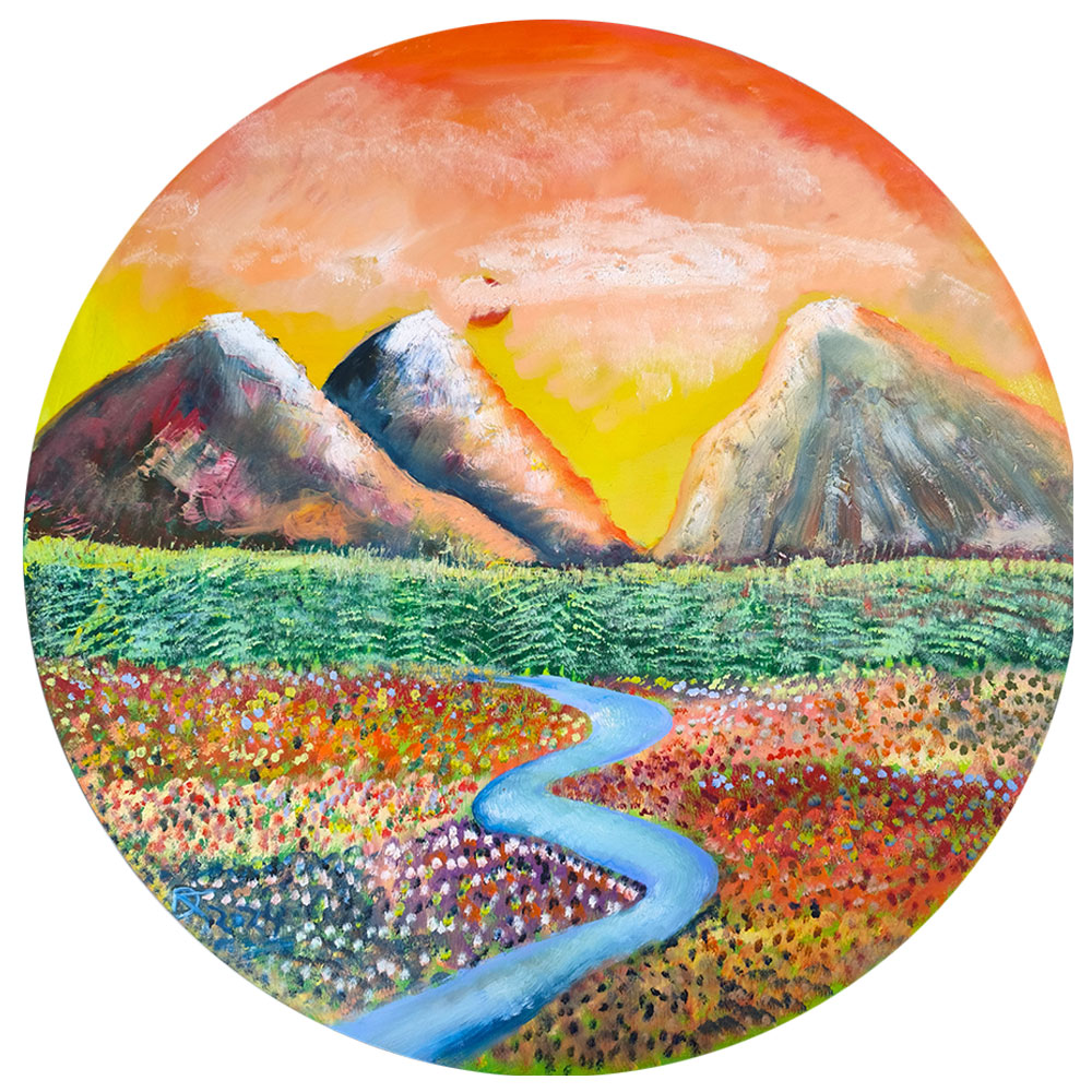 This radiant oil painting on round stretched canvas depicts an enchanting landscape where mountains meet the horizon beneath a luminous golden sky. Richly textured peaks rise majestically above lush green woods, while an inviting blue river gracefully winds through fields bursting with colorful wildflowers. The composition is alive with vivid oranges, yellows, and soft pastels, creating an atmosphere of warmth and joyous serenity. This artwork effortlessly captures the essence of nature’s boundless beauty, making it a perfect focal point to infuse any room with uplifting energy and charm.