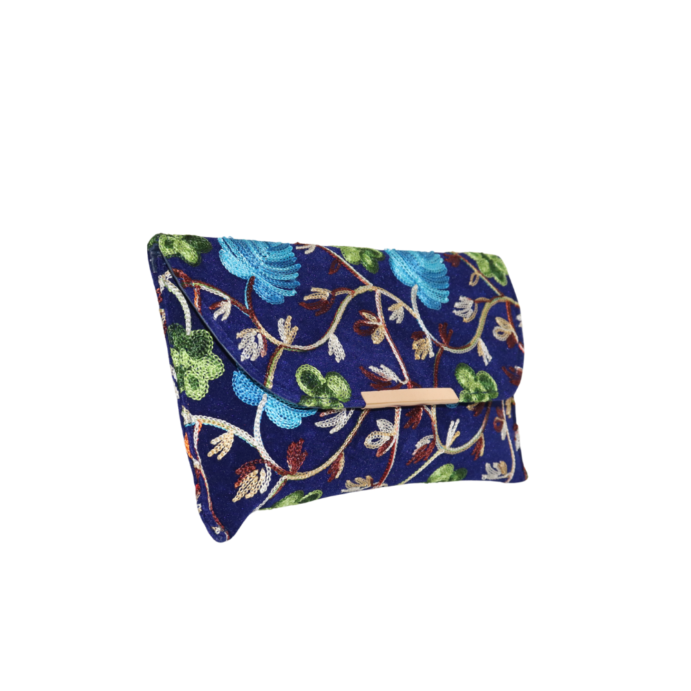 Brighten up any outfit with this handmade velvet clutch featuring intricate floral beadwork in vibrant colors. The beautiful design showcases a mix of blue, green, and gold embroidery on rich navy velvet, creating a striking contrast that makes this clutch stand out. Perfect for weddings, parties, or casual evening events, this clutch offers both style and function. The durable gold chain strap provides easy and comfortable carrying, while the compact interior holds your essentials, including a phone, cards, and makeup. This handcrafted accessory combines luxury, artistry, and practicality in one stunning piece. Whether dressing up for a special occasion or adding a pop of color to a more casual look, this clutch will be the perfect companion. Its timeless appeal and vibrant design make it a must-have accessory for anyone looking to make a statement.