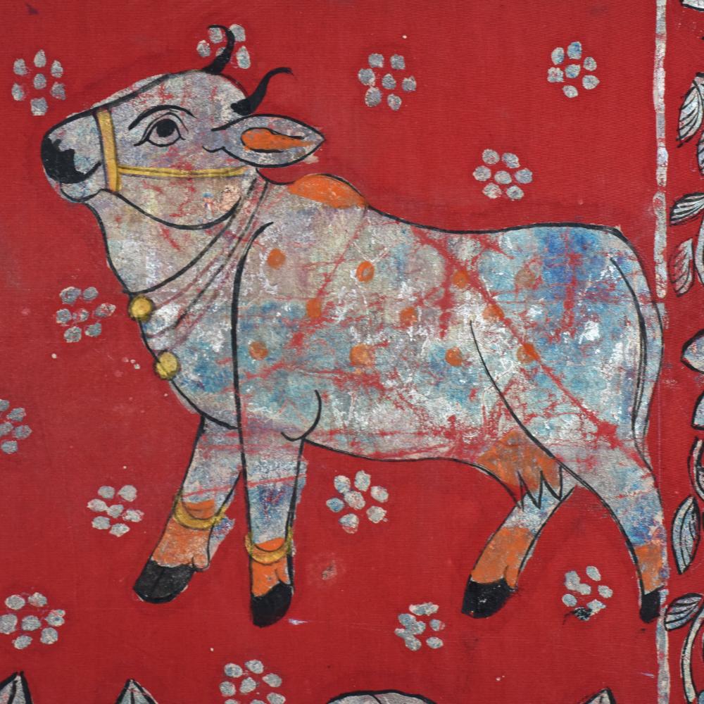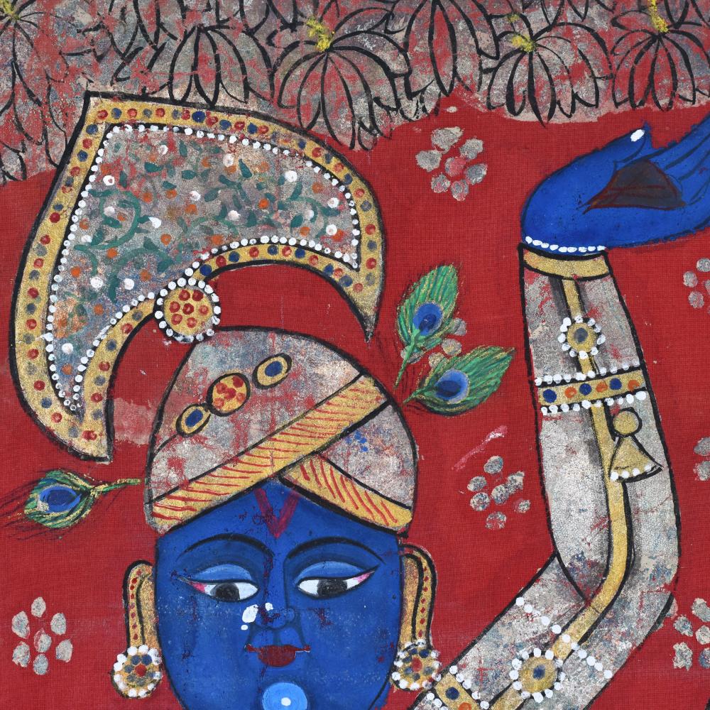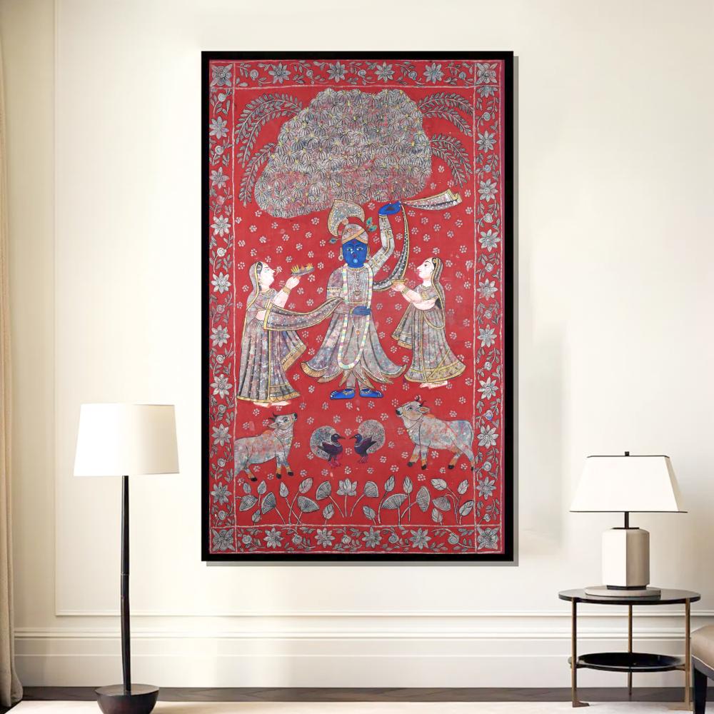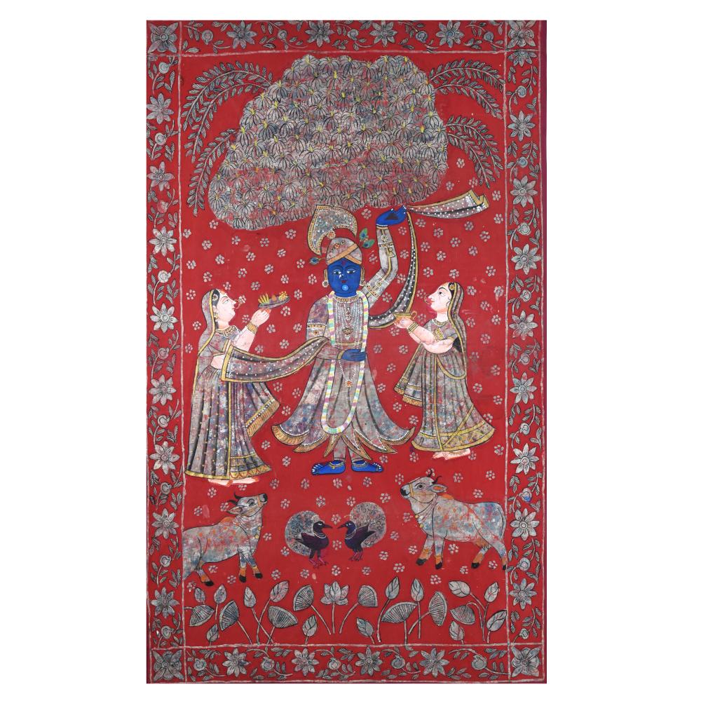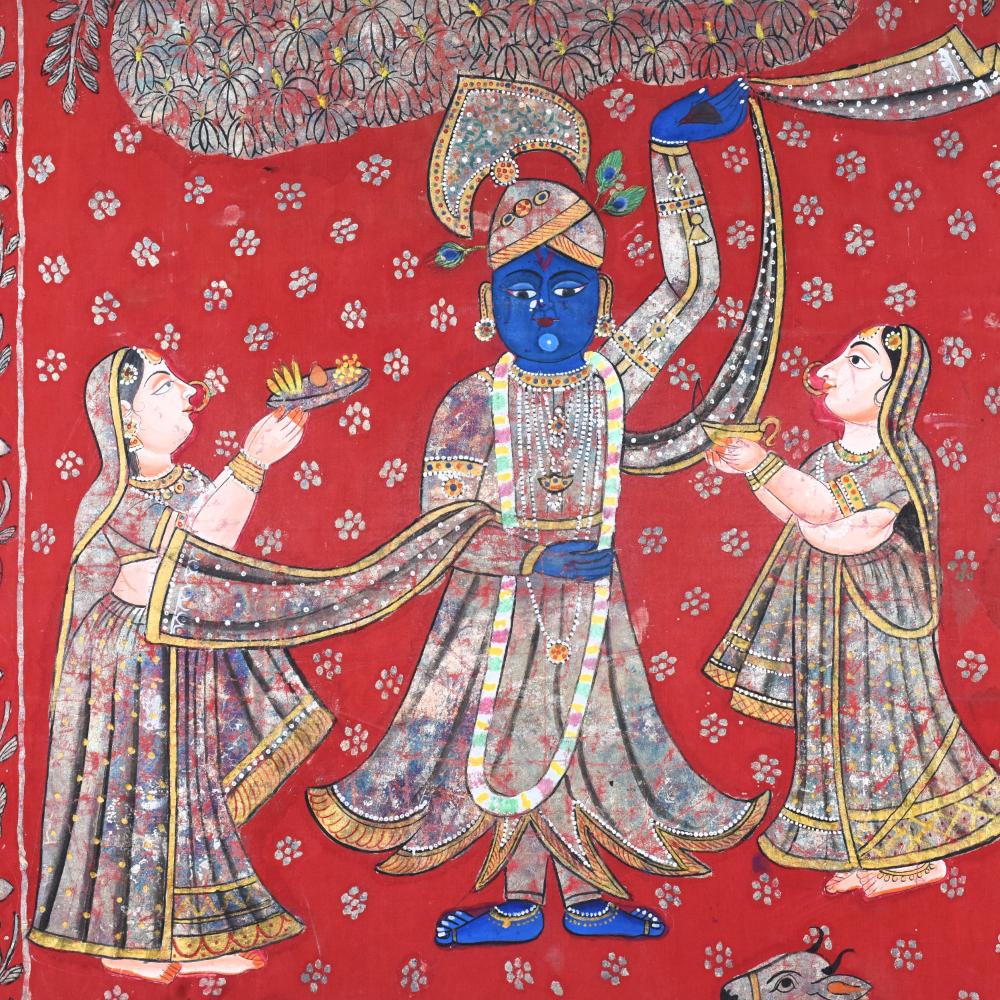 - Exquisitely hand-painted cloth pichwai depicting Lord Krishna with two gopis, two cows, and two peacocks