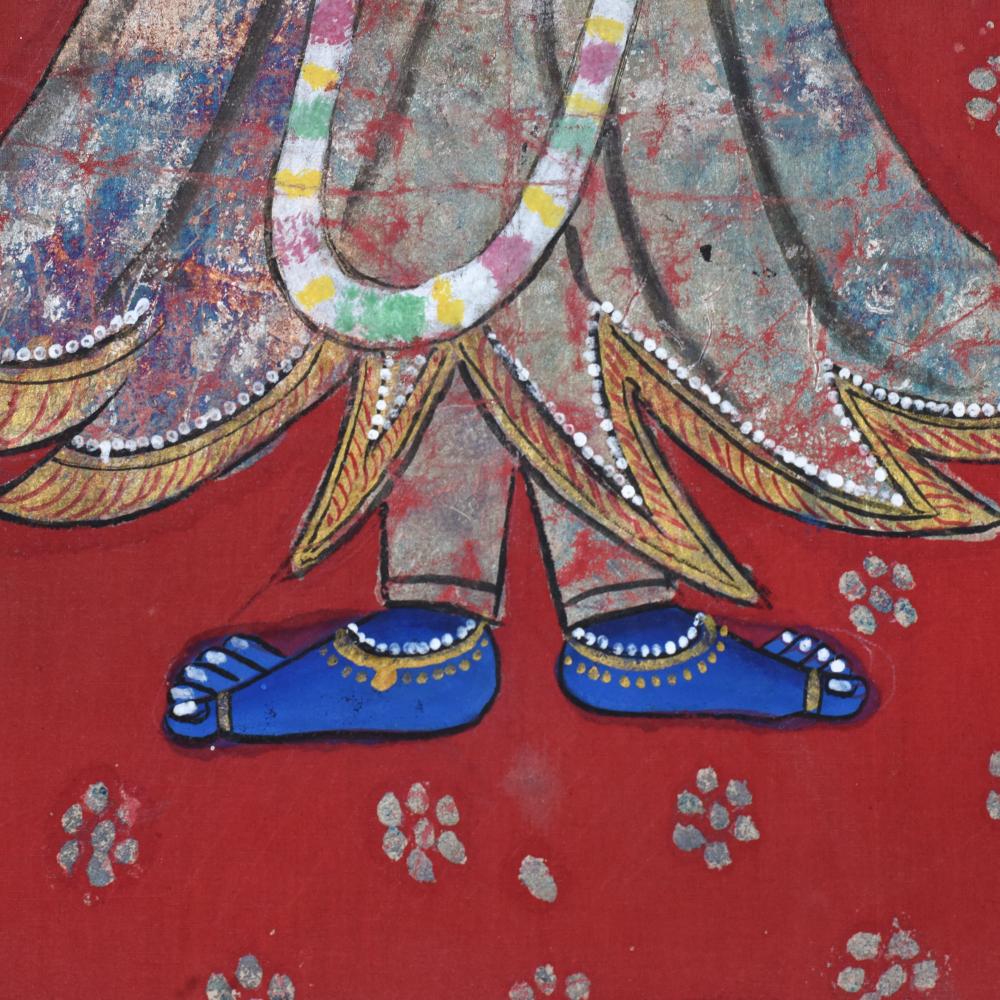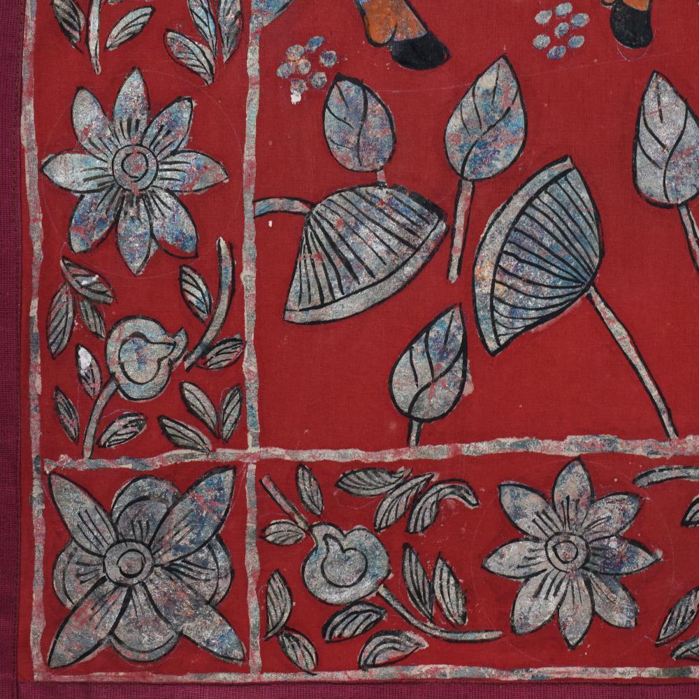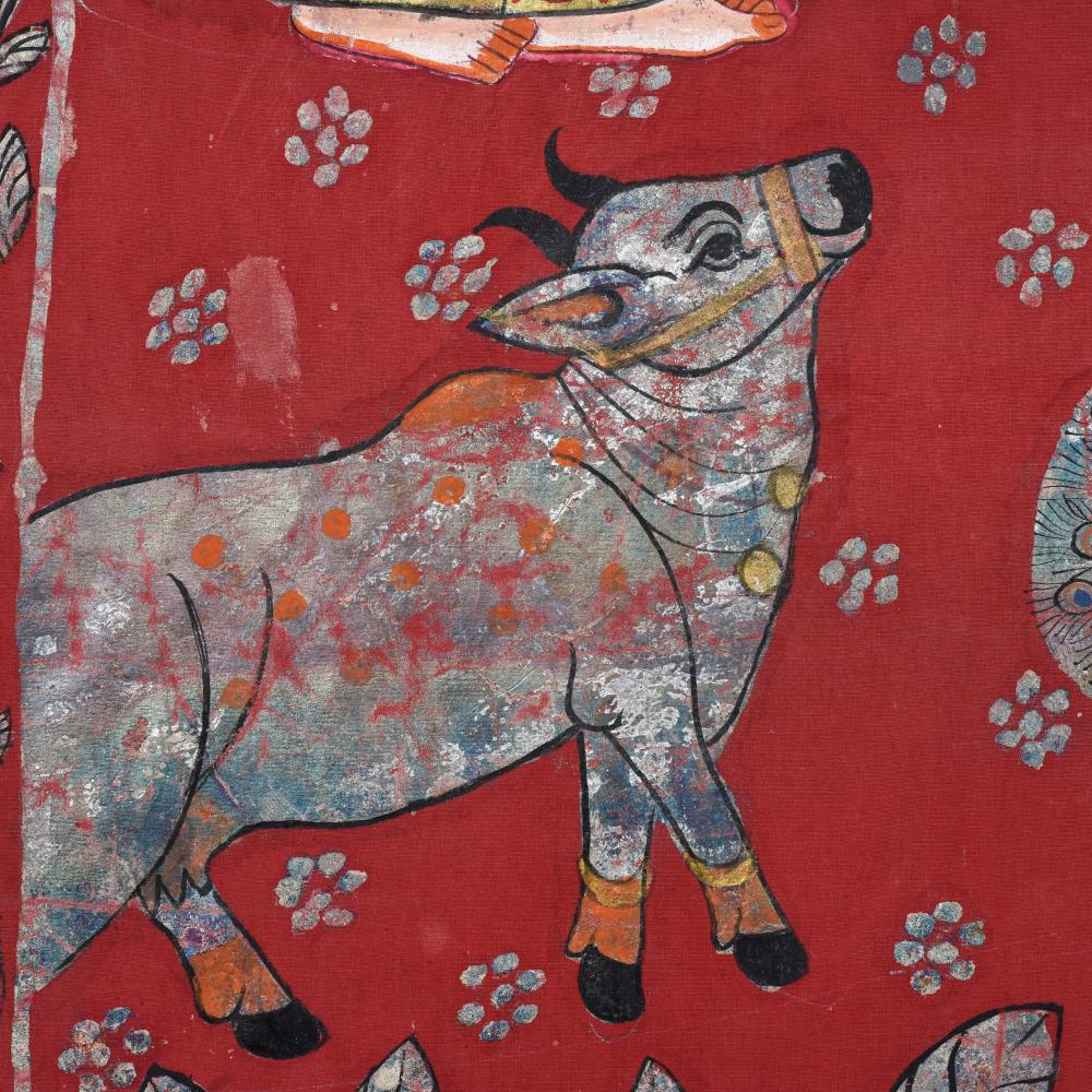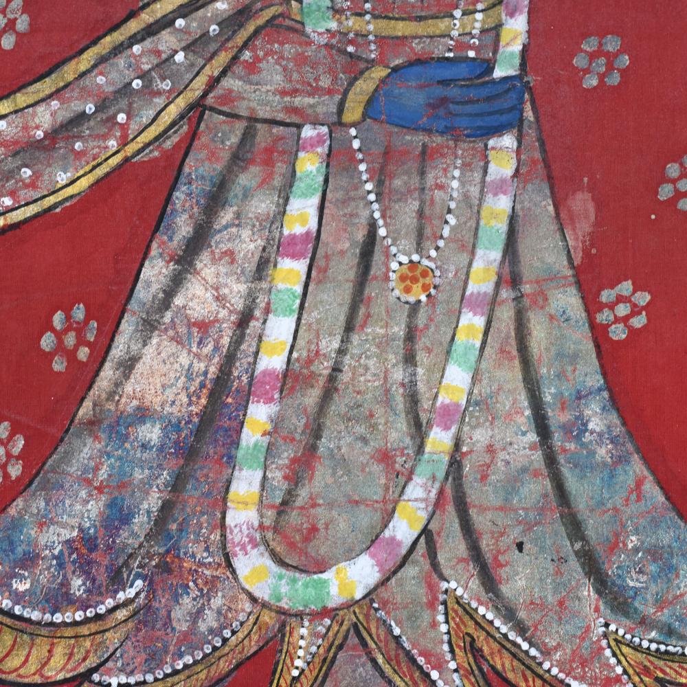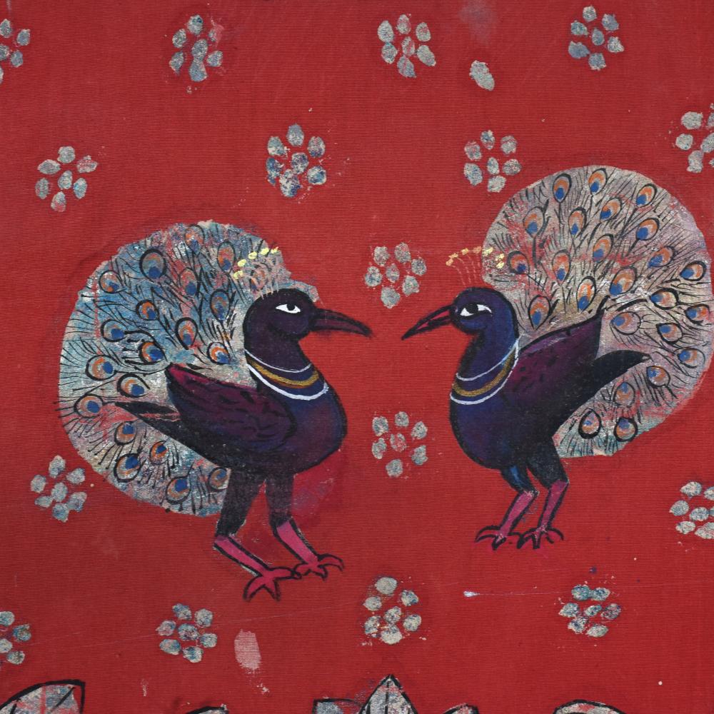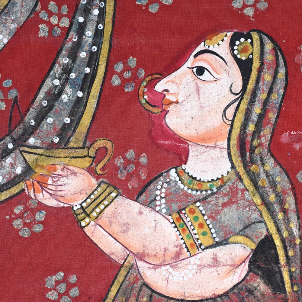 - Exquisitely hand-painted cloth pichwai depicting Lord Krishna with two gopis, two cows, and two peacocks