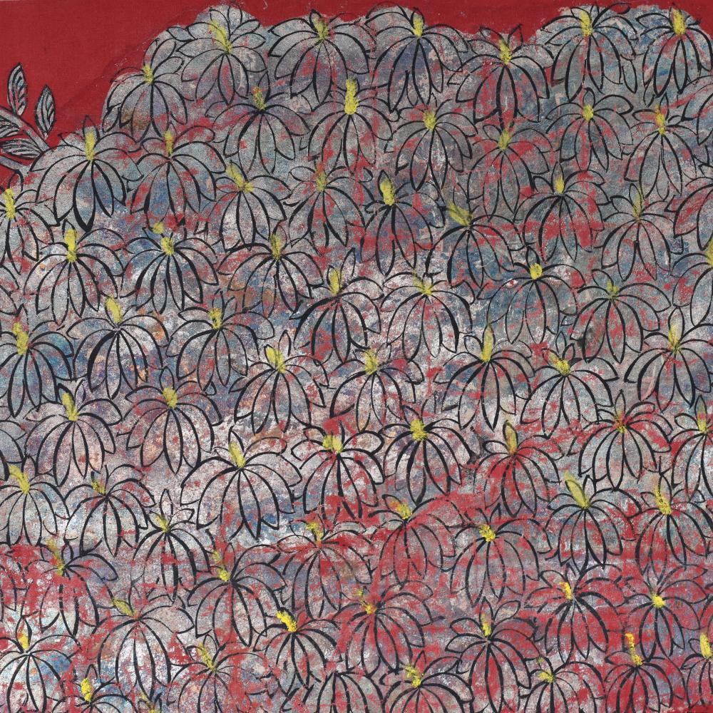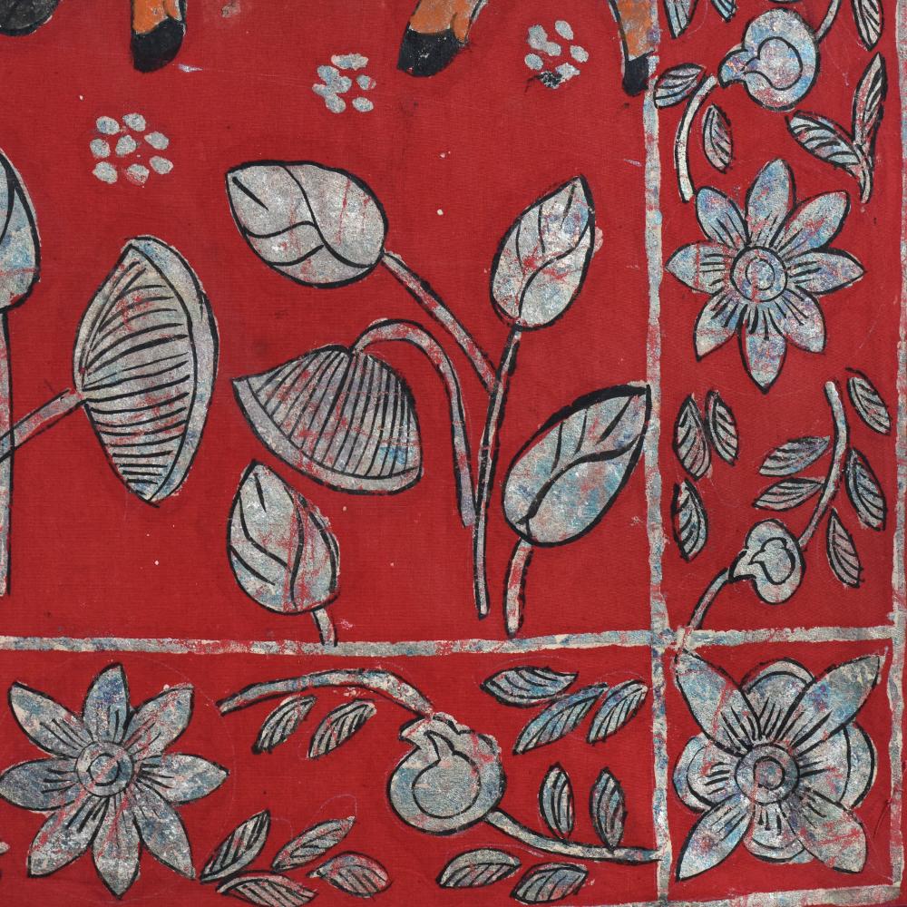 Gaze upon this breathtaking pichwai painting and feel the tranquility of Lord Krishna's presence without frame. The masterful brushstrokes capture the gentle sway of the gopis as they attend to the beloved deity, while the majestic cows and regal peacocks add to the sense of divine harmony. The deep red backdrop provides a dramatic contrast, allowing the ornate floral border to blossom with life. This exquisite work of art is not merely a decoration, but a portal to a realm of timeless spirituality. Display this pichwai in your home or meditation space, and let its captivating energy inspire you to connect with the divine. Whether you are a devotee of Krishna or simply appreciate the beauty of Indian art, this painting will become a cherished centerpiece that elevates the ambiance of any space.