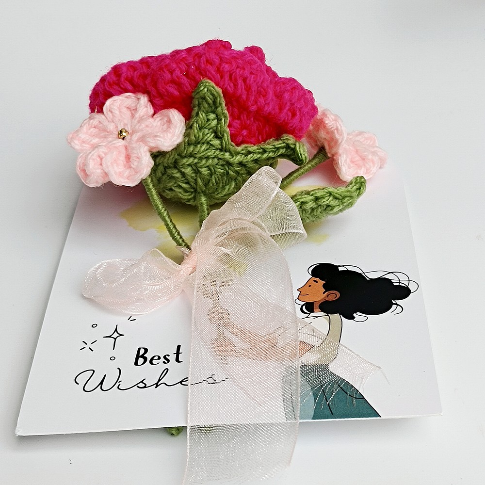 Keep your pink crochet piece away from moisture and direct sun to prevent dust and fading. Dust gently with a soft brush or a hairdryer on cool, and reshape stems carefully if needed.
