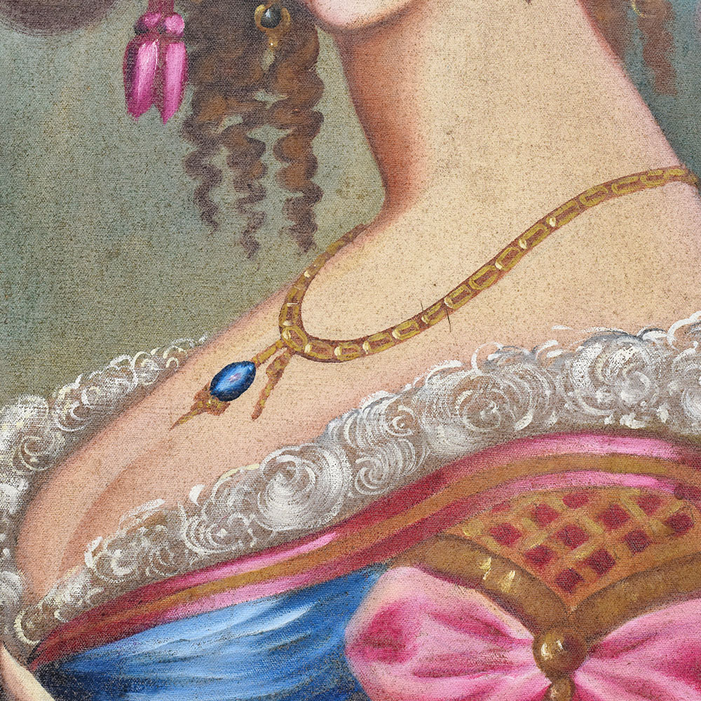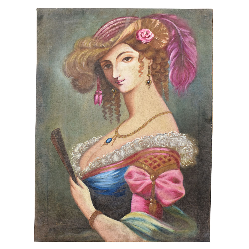 This elegant acrylic on canvas painting portrays a regal woman exuding poise, charm, and classical beauty. Inspired by European aristocratic portraiture, the subject is adorned in opulent attire featuring rich fabrics, a lace-trimmed neckline, and vibrant accents of pink and blue. Her elaborate hairstyle, decorated with feathers and a rose, along with her jeweled accessories, evokes the sophistication of the Rococo or Victorian era. Holding a delicate fan and casting a confident yet mysterious gaze, she embodies grace and refinement. The soft, diffused background places full attention on the figure, enhancing the timeless allure and theatrical elegance of the composition.