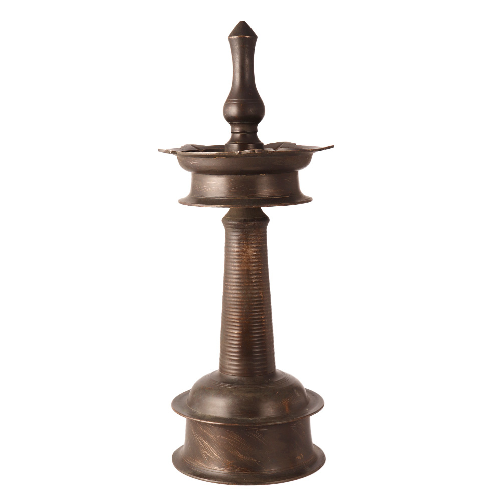 The Vintage Brass Kerala Lamp is a traditional Hindu lighting item from the Indian state of Kerala. It is made of brass and has a unique design that sets it apart from other traditional lamps. The lamp features a cylindrical body with intricate carvings and embellishments, including Hindu symbols and motifs. The lamp also has a small handle for easy handling and is designed to be filled with oil, providing a warm and inviting light when lit. The vintage art brass Kerala Lamp is commonly used in Hindu homes and temples for daily prayers and rituals. It is also a popular decorative item, adding a touch of elegance and sophistication to any room. The brass material and vintage design make it a collectible item, prized by those who appreciate traditional Indian art and culture. The lamp is both functional and beautiful, making it a valuable addition to any Hindu home or temple.