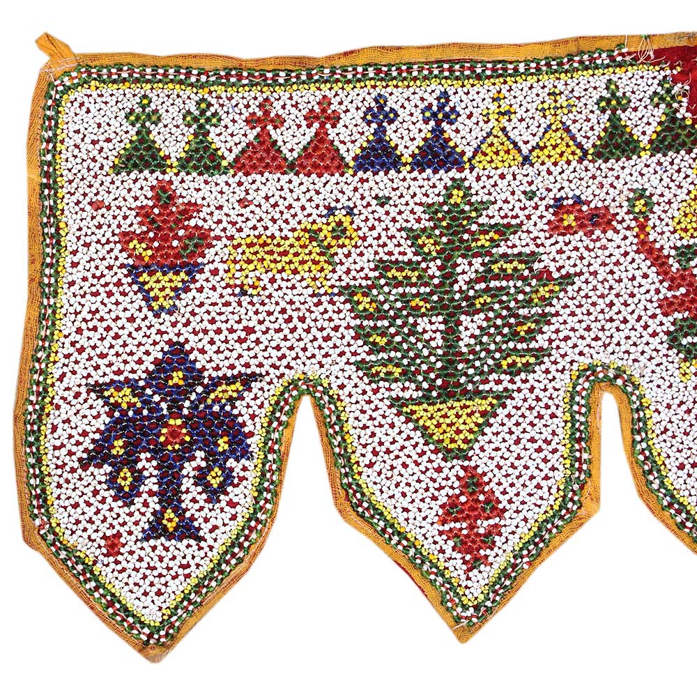 Vintage Beaded Toran entrance hanging from Gujrat shows lord Ganesh, the popular elephant Deity who brings good fortune, is shown in the focal theme. He is surrounded by floral and good luck symbols. The hanging would have been used to decorate a bridal cart or hung above a door for special events.