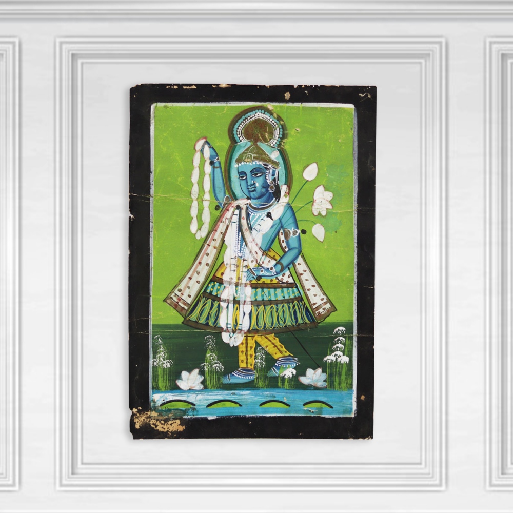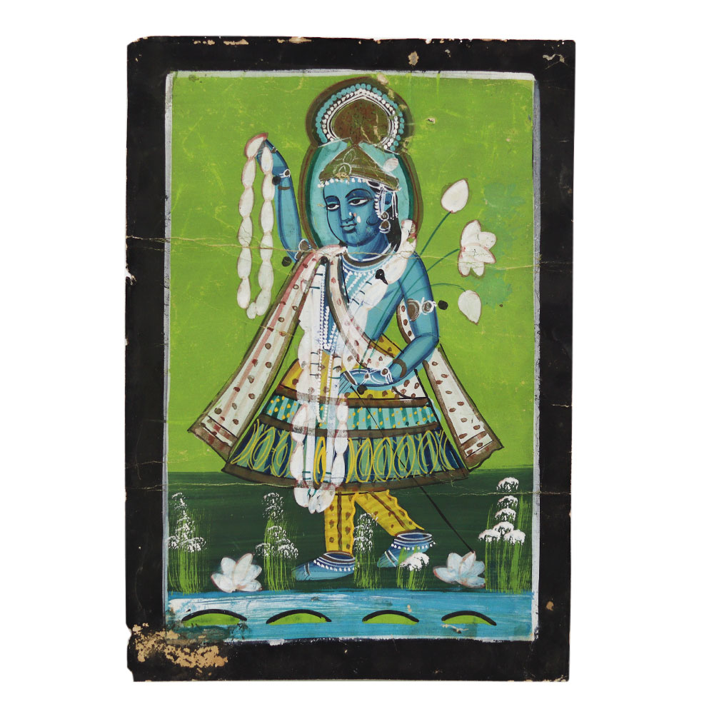Step into the captivating world of Lord Krishna with this exquisite Vintage Old Paper Painting. Crafted with meticulous attention to detail, this stunning artwork masterfully captures the divine essence of the revered deity, transporting you to a realm of spiritual serenity. This painting is more than just a work of art - it's a testament to the enduring legacy of Hindu mythology and spirituality. Gaze upon the serene countenance of Lord Krishna and feel a sense of peace and inspiration wash over you. Let the painting's timeless beauty ignite your imagination and deepen your connection to the divine. Whether you're a collector of fine art, a devotee of Lord Krishna, or simply someone who appreciates the beauty of the past, this Vintage Old Paper Painting is a must-have addition to your collection. Elevate your living space and surround yourself with the timeless elegance of this exceptional piece. Embark on a journey of spiritual and artistic discovery with this Vintage Old Paper Painting of Lord Krishna.