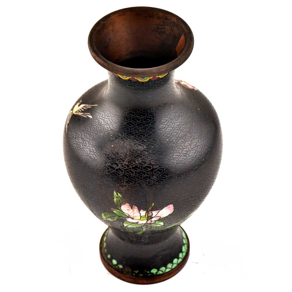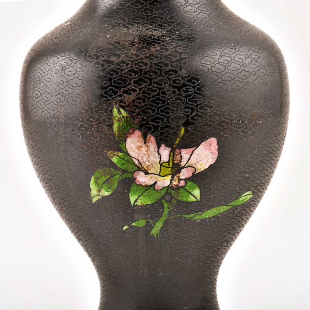 Decorative enameled metal ware called cloisonné exhibit almost superhuman skill by master craftsmen displayed by the marvelous diversity, intricacy and beauty of their designs. Earliest decorative motifs include cloud patterns, lotus flowers, the symbol of purity and beauty later motifs included dragons amid clouds, floral landscapes, scenes from court and mystical animals. Exquisitely detailed petals and leaves with fine color gradations. Fine inlaid wirework at neck and base, which are edged in brass. Exquisitely detailed petals and leaves with fine color gradations. Dark cobalt blue ground with white, rust, orange, yellow, and mauve blossoms; foliage in shades of green edged in rust are some of the popular designs of cloisonné.