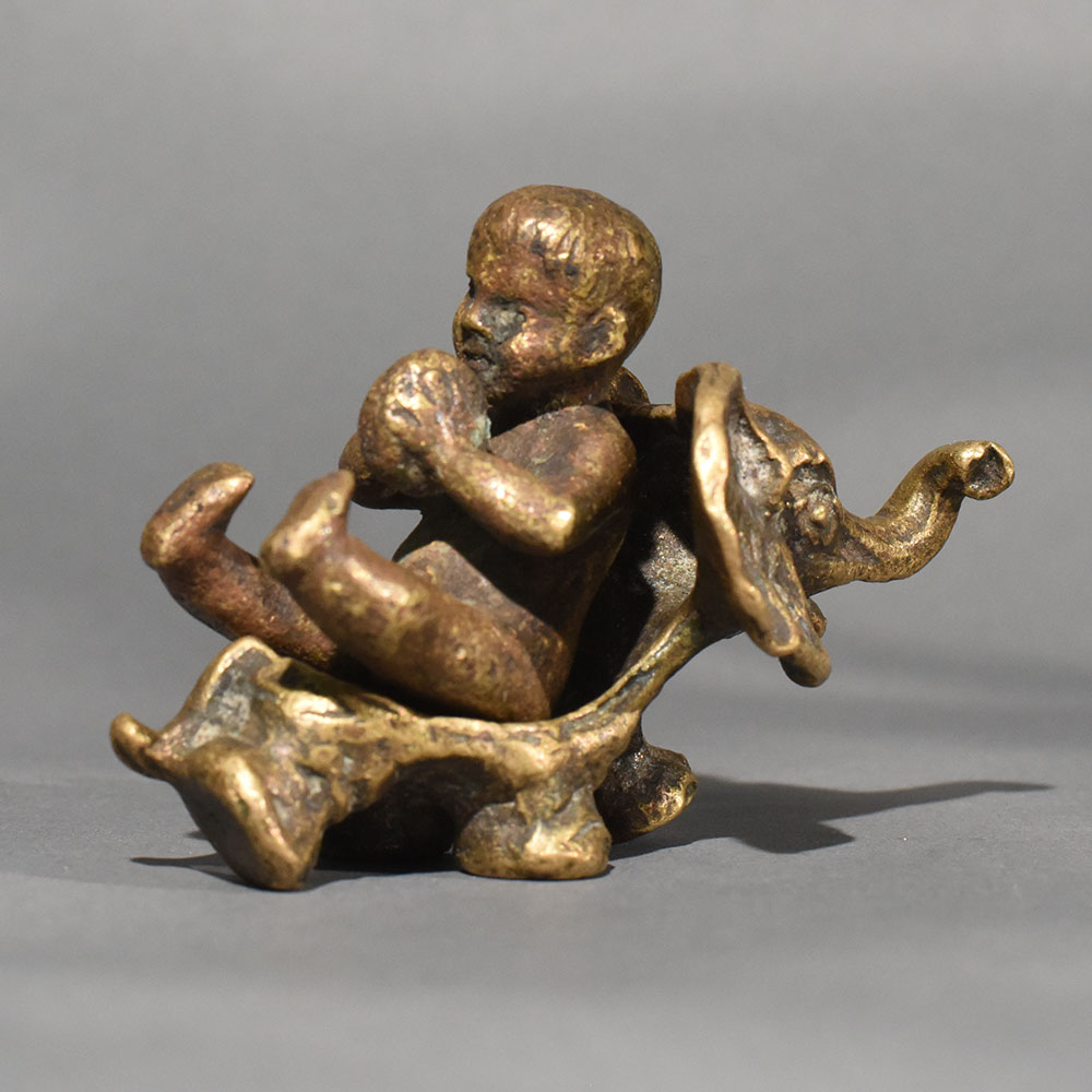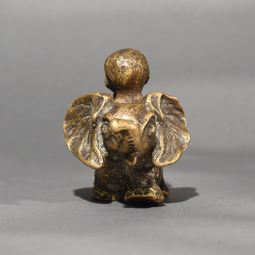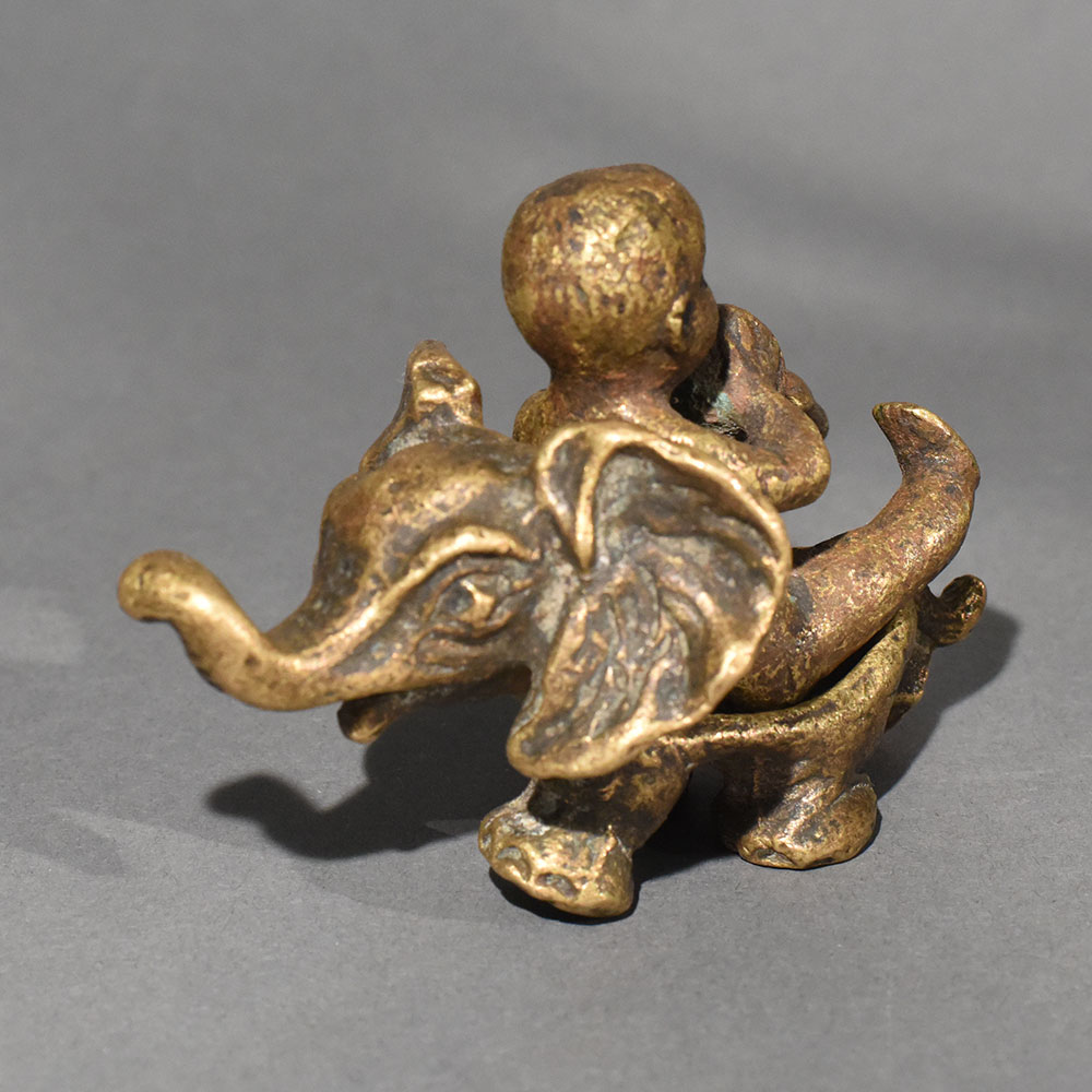 This vintage brass baby on elephant statue is a charming symbol of innocence, protection, and joyful companionship. Handcrafted in solid brass, the sculpture captures a playful baby seated atop a gentle elephant, a timeless motif associated with wisdom, strength, and good fortune. The warm aged patina enhances its antique appeal, giving the piece a soulful, heirloom-quality finish that blends beautifully with both traditional and eclectic interiors. Every curve and detail reflects skilled artisan workmanship, from the elephants expressive trunk to the babys relaxed posture. The compact size makes it ideal for tabletops, shelves, pooja rooms, or curated dcor corners. This figurine also holds cultural significance, often considered a symbol of positivity, nurturing energy, and harmony in Indian dcor traditions. Perfect as a thoughtful gift or a meaningful collectible, this brass statue adds warmth and storytelling to any space. Whether styled in a living room, study, or spiritual setting, it stands out as a timeless decorative accent that celebrates craftsmanship and cultural artistry.