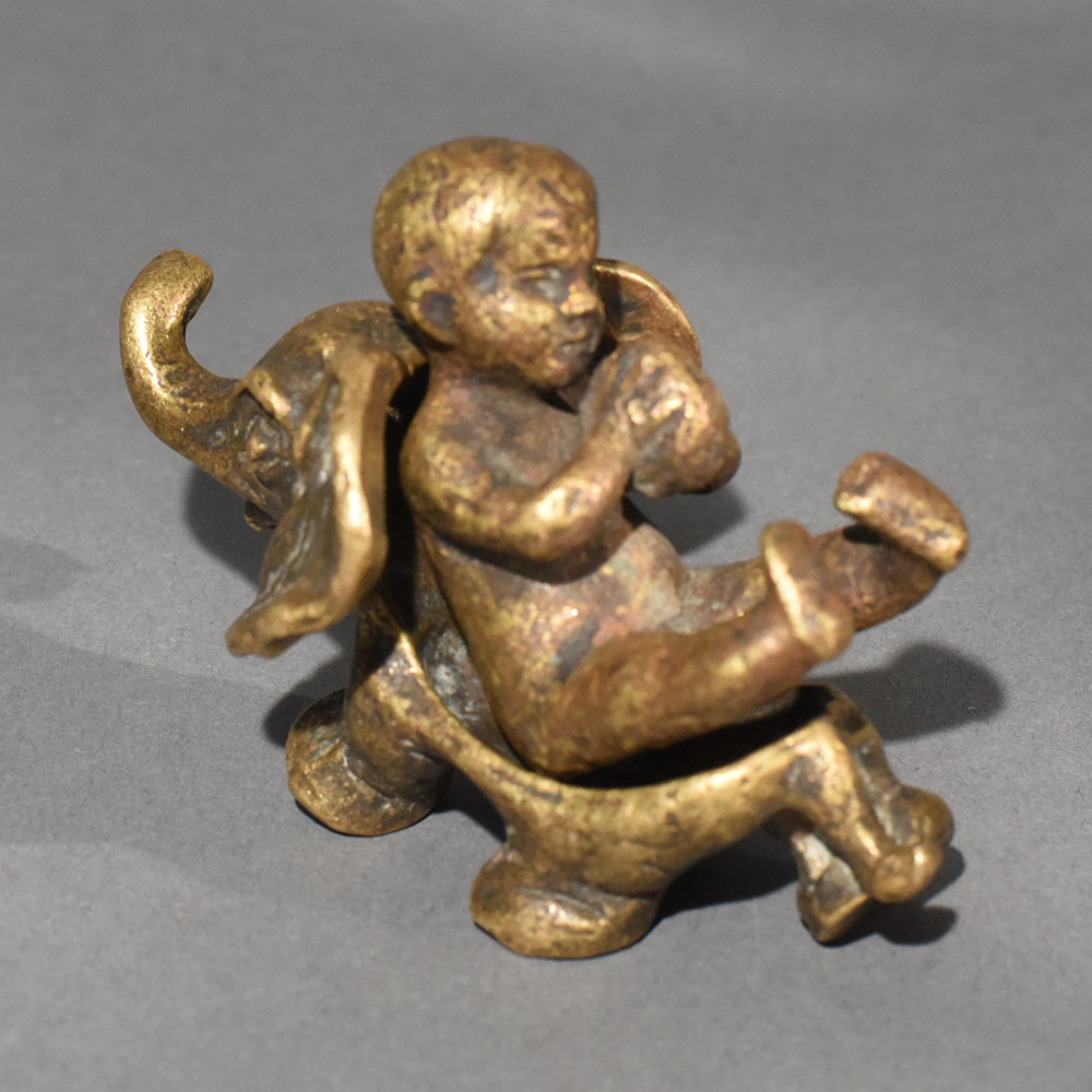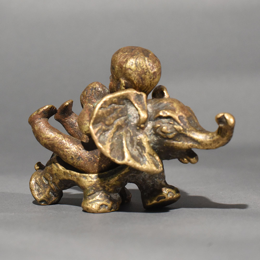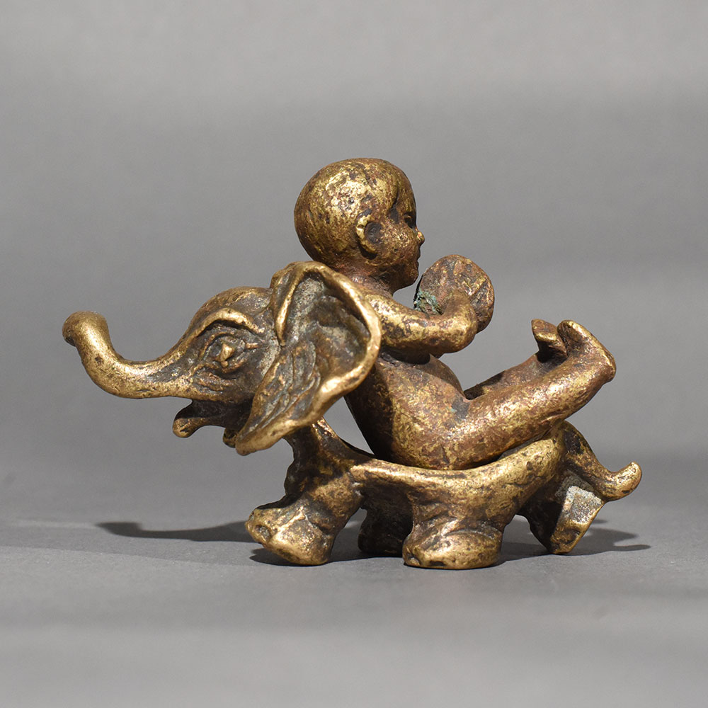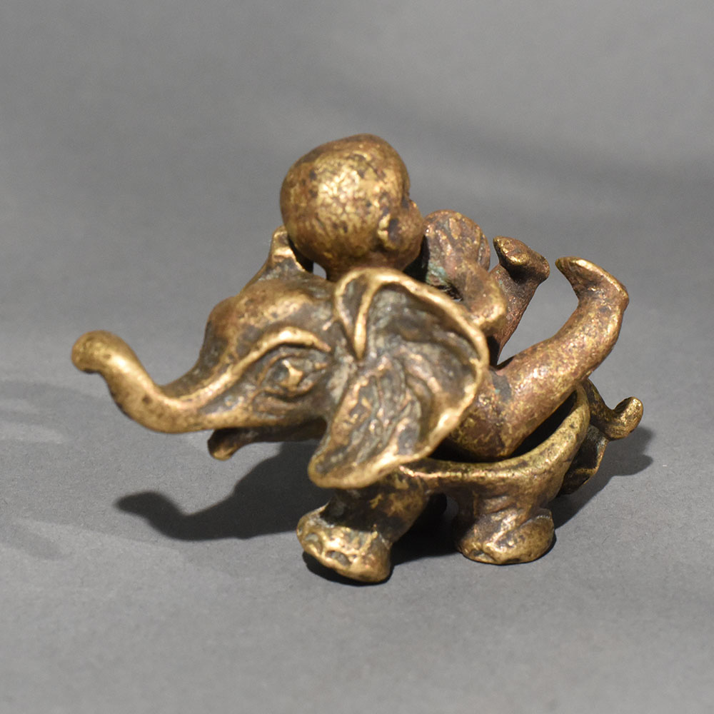 This vintage brass baby on elephant statue is a charming symbol of innocence, protection, and joyful companionship. Handcrafted in solid brass, the sculpture captures a playful baby seated atop a gentle elephant, a timeless motif associated with wisdom, strength, and good fortune. The warm aged patina enhances its antique appeal, giving the piece a soulful, heirloom-quality finish that blends beautifully with both traditional and eclectic interiors. Every curve and detail reflects skilled artisan workmanship, from the elephants expressive trunk to the babys relaxed posture. The compact size makes it ideal for tabletops, shelves, pooja rooms, or curated dcor corners. This figurine also holds cultural significance, often considered a symbol of positivity, nurturing energy, and harmony in Indian dcor traditions. Perfect as a thoughtful gift or a meaningful collectible, this brass statue adds warmth and storytelling to any space. Whether styled in a living room, study, or spiritual setting, it stands out as a timeless decorative accent that celebrates craftsmanship and cultural artistry.