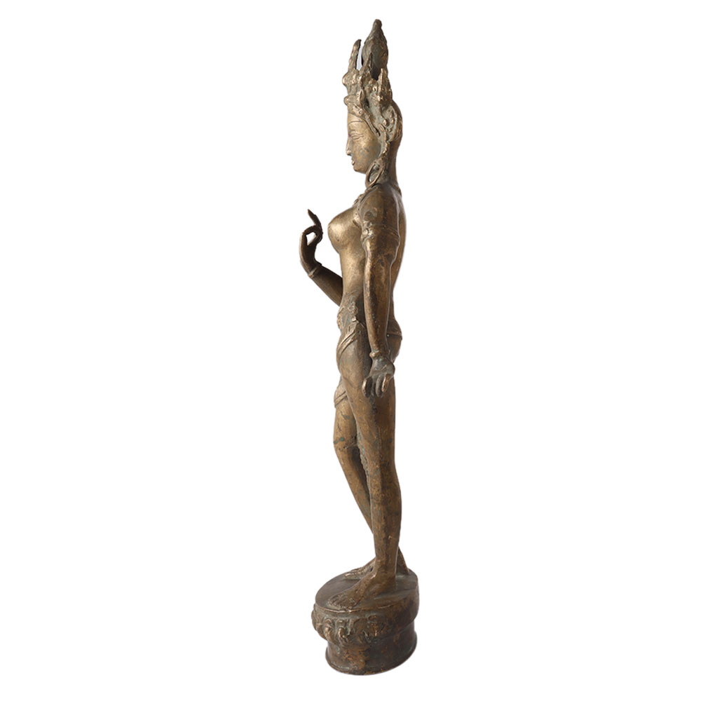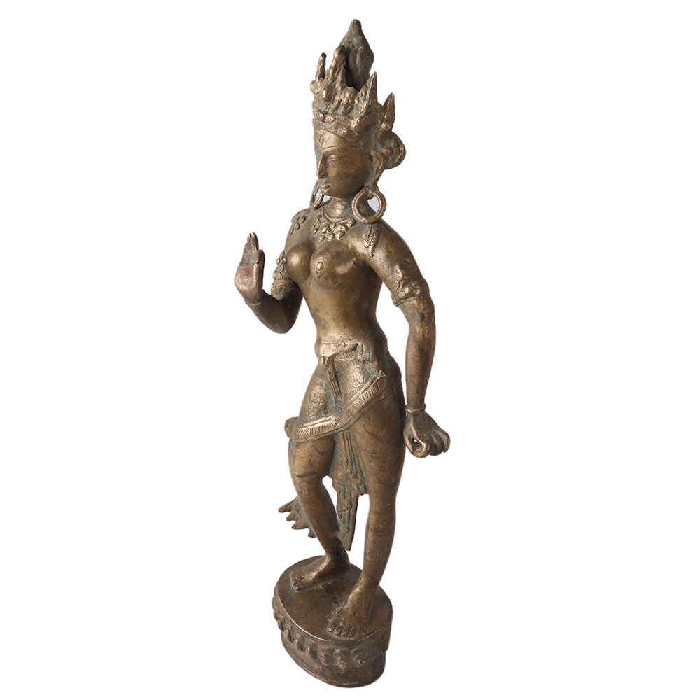 Made of high quality brass, this standing statue of Buddhist Tara is carved in Tibetan art by artisans who are highly skilled and experienced. This sculpture is crafted with intricate details that makes it a perfect piece for display and decoration on table or shelf. Exhibit this beautiful sculpture in your home to enhance the interior design of the room. Add an incredible and collectible piece to your vintage collection. An ideal gift for Diwali, wedding, anniversary or birthday occasions for your near and dear ones.