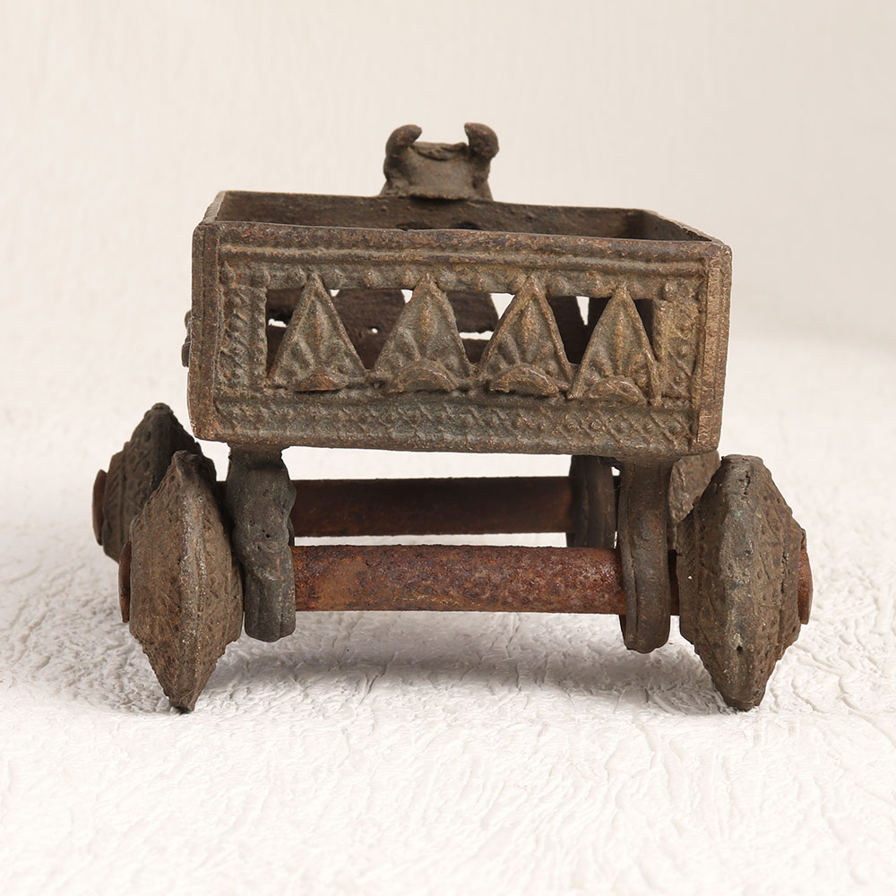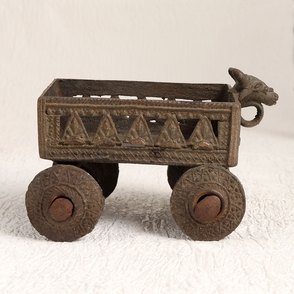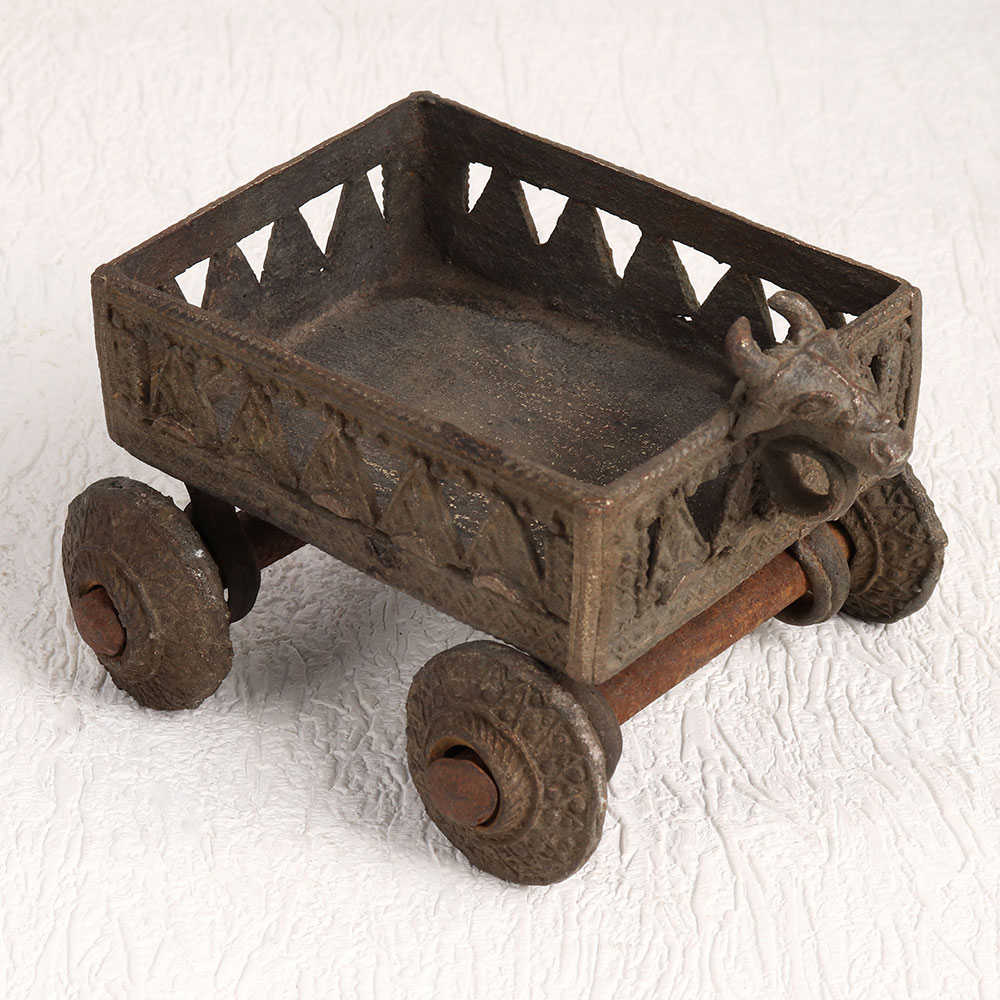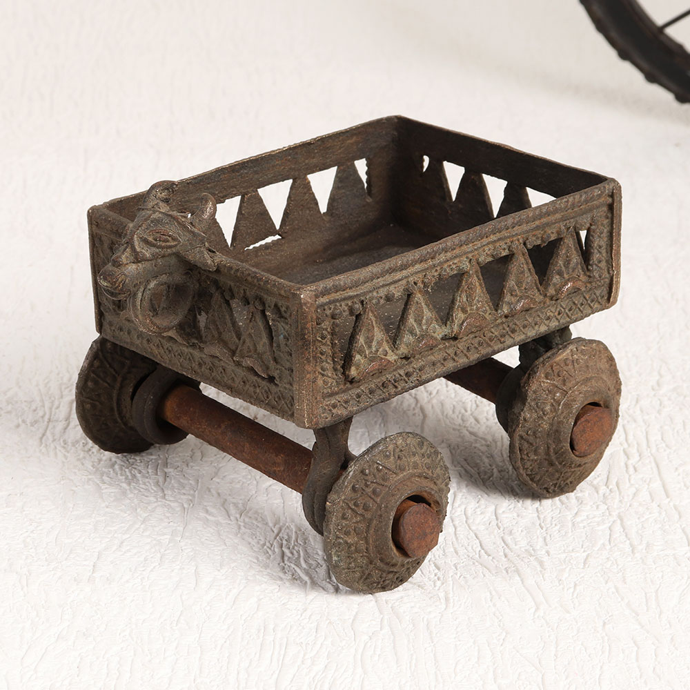 Buy a Vintage Brass Cart online that is a stunning blend of history, functionality, and aesthetics. Handcrafted by highly talented craftsmen in the age-old tradition of Tribal Art, this exceptional piece is a testament to their dedication and expertise. This antique brown-finished brass cart boasts an exquisite design featuring four intricate wheels and a majestic bull head at the front, paying homage to traditional motifs. Its elegant, vintage charm is further enhanced by the use of high-quality brass, ensuring both durability and an authentic, timeless appeal. Versatile in purpose, this cart serves as a small flower pot, bringing nature's beauty into your living spaces. It's not just a decorative item, it's a piece of history that can elevate the ambiance of your home, office, restaurant, hotel, cafe, or shop. It's perfect for adding a touch of elegance to your prayer room, making it suitable for spiritual moments. Whether you're an avid collector of vintage treasures or wish to showcase it at an exhibition, our Vintage Brass Cart is a unique addition that tells a story. It's also an exquisite gift option for your family, friends or relatives on special, festive, or auspicious occasions, symbolizing your appreciation for their timeless presence in your life.