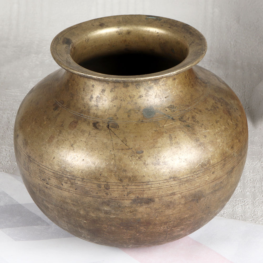 Buy a Vintage Brass Cooking Pot online that is an authentic masterpiece painstakingly handcrafted by highly talented Indian craftsmen. Crafted with meticulous attention to detail, this brass pot showcases a captivating antique brown finish, exuding an air of timeless elegance. Made from high-quality brass, this pot not only embodies the craftsmanship of a bygone era but also boasts durability and longevity. Its versatile design makes it a perfect addition to your home, office, restaurant, hotel, cafe, or shop, enhancing any setting with its vintage charm. While its original purpose was for cooking, we recommend using this vintage treasure primarily for decorative purposes. This splendid piece can be an enchanting flower pot or serve as an elegant accent during rituals, havan, or prayer ceremonies, adding a touch of tradition and spirituality to your space. Ideal for collectors, this vintage brass pot can be a prized addition to your antique collection or showcased at exhibitions to appreciate its historical significance. It also makes for a thoughtful and cherished gift for your family, friends or relatives on special, festive, or auspicious occasions, carrying with it the rich heritage of Indian craftsmanship.