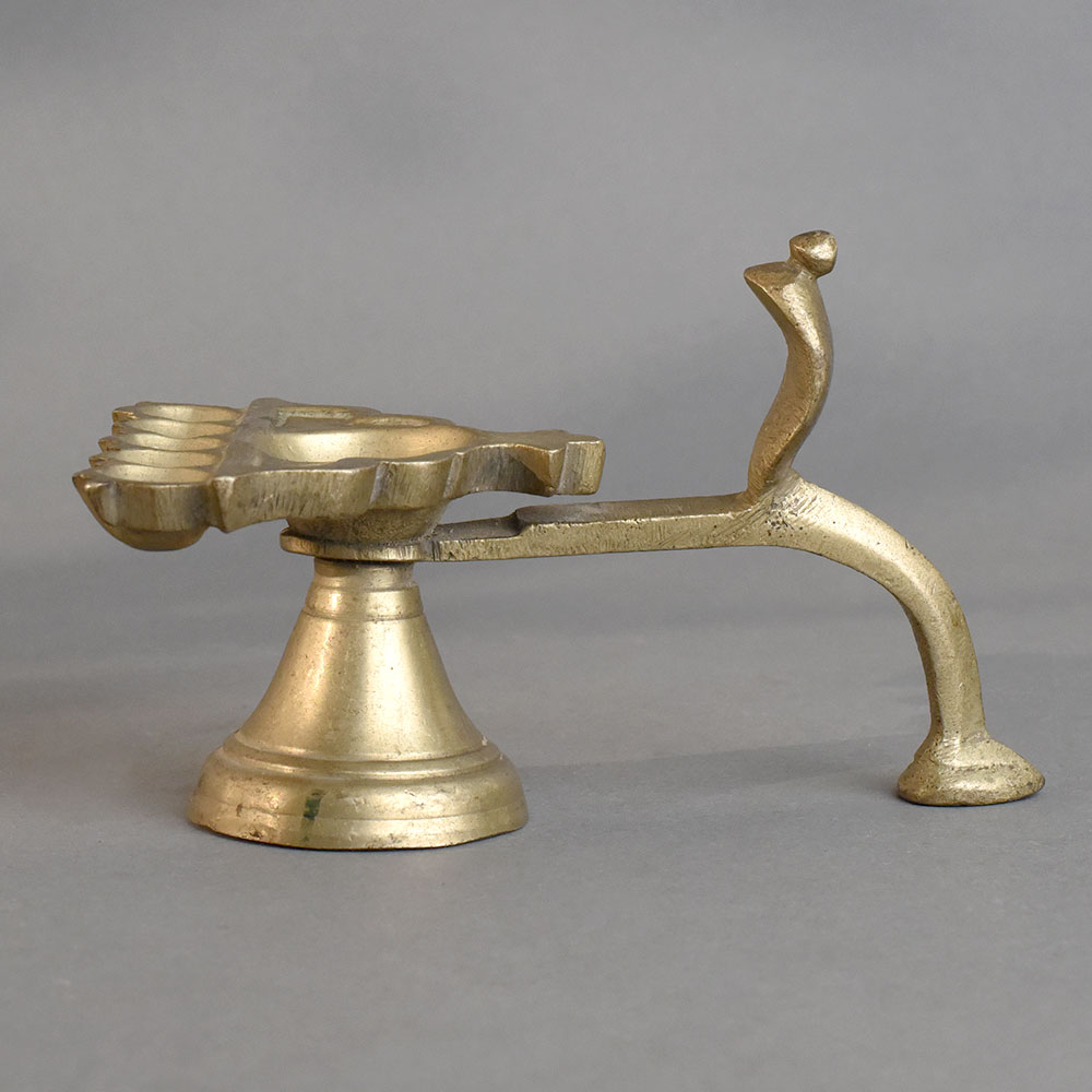 This vintage brass aarti oil lamp with handle is a traditional piece of Indian devotional art, designed for spiritual rituals and ceremonies. Featuring five small cavities for wicks, it allows multiple jyots to be lit at once, spreading divine energy and positivity during pooja. The lamp is crafted from durable solid brass, giving it strength, longevity, and an authentic antique appearance. Its sturdy handle ensures easy holding while performing aarti, making it both practical and devotional. The elegant base and carved detailing highlight its handmade craftsmanship, reflecting the cultural heritage of India. Ideal for temples, pooja rooms, and auspicious occasions, this lamp serves as both a functional ritual item and a collectible decor piece that embodies timeless tradition.