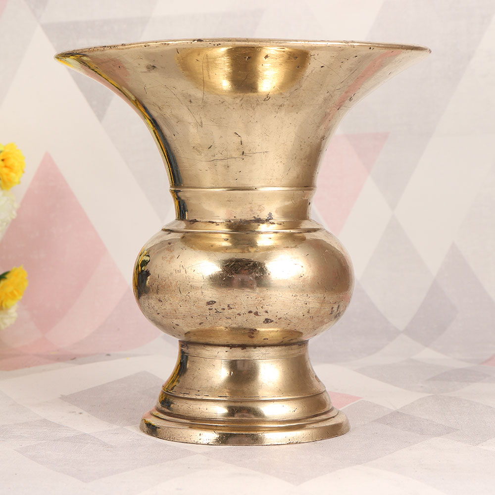This Vintage Brass Flower Pot in an Antique Brown Finish is an exquisite piece of artistry that transcends time and culture. Crafted with precision and passion by highly skilled and experienced Indian craftsmen hailing from the enchanting region of South India, this masterpiece is a testament to their unrivalled craftsmanship. Forged from high-quality brass, this flower pot boasts not only enduring durability but also an alluring antique brown finish that exudes an aura of timeless elegance. Its versatility knows no bounds, making it a captivating addition to any setting. Whether adorning your home, office, restaurant, hotel, or cafe, this flower pot serves as an exceptional decorative piece, adding a touch of sophistication and nature's beauty to any space. Furthermore, this magnificent creation holds its own in the world of vintage collectibles. Ideal for inclusion in a museum or exhibition, it tells a story of India's rich artistic heritage and the skillful hands that shaped it. Looking for the perfect gift? Look no further. This vintage brass flower pot makes a cherished present for your family, friends or relatives on special, festive, or auspicious occasions.