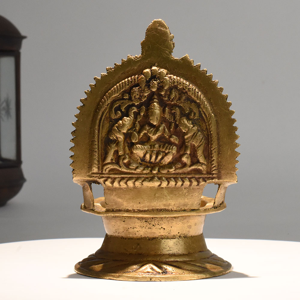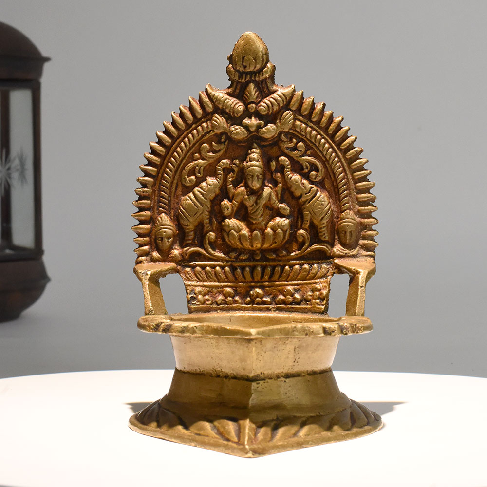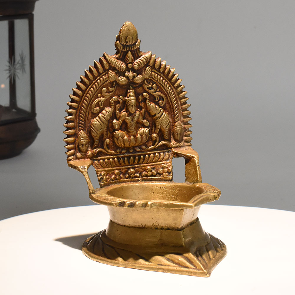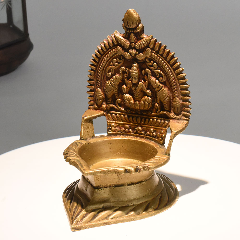 - Vintage brass diya with detailed Lakshmi carving