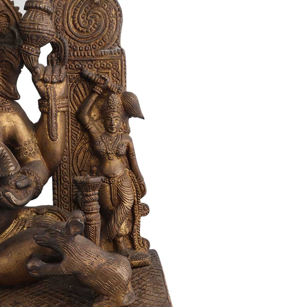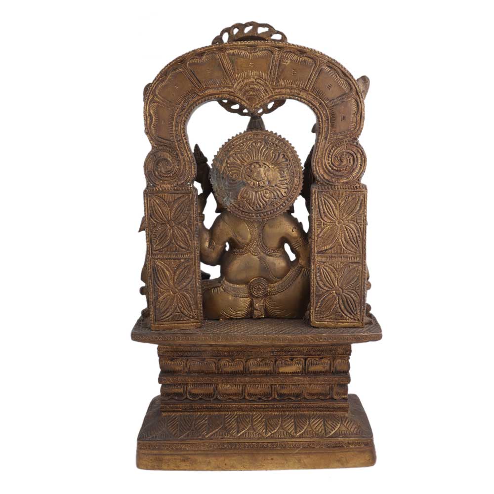 Exquisite brass statue of lord ganesha seated on his aasan that has several figurines at the base and a lovely prabhavali with intricate design and sun god on top. There are a few angel figurines showering flowers on lord ganesha with his favorite mooshak besides him. Wedding gift, diwali gift, house warming gift, stage decoration, hotel and spa decoration.