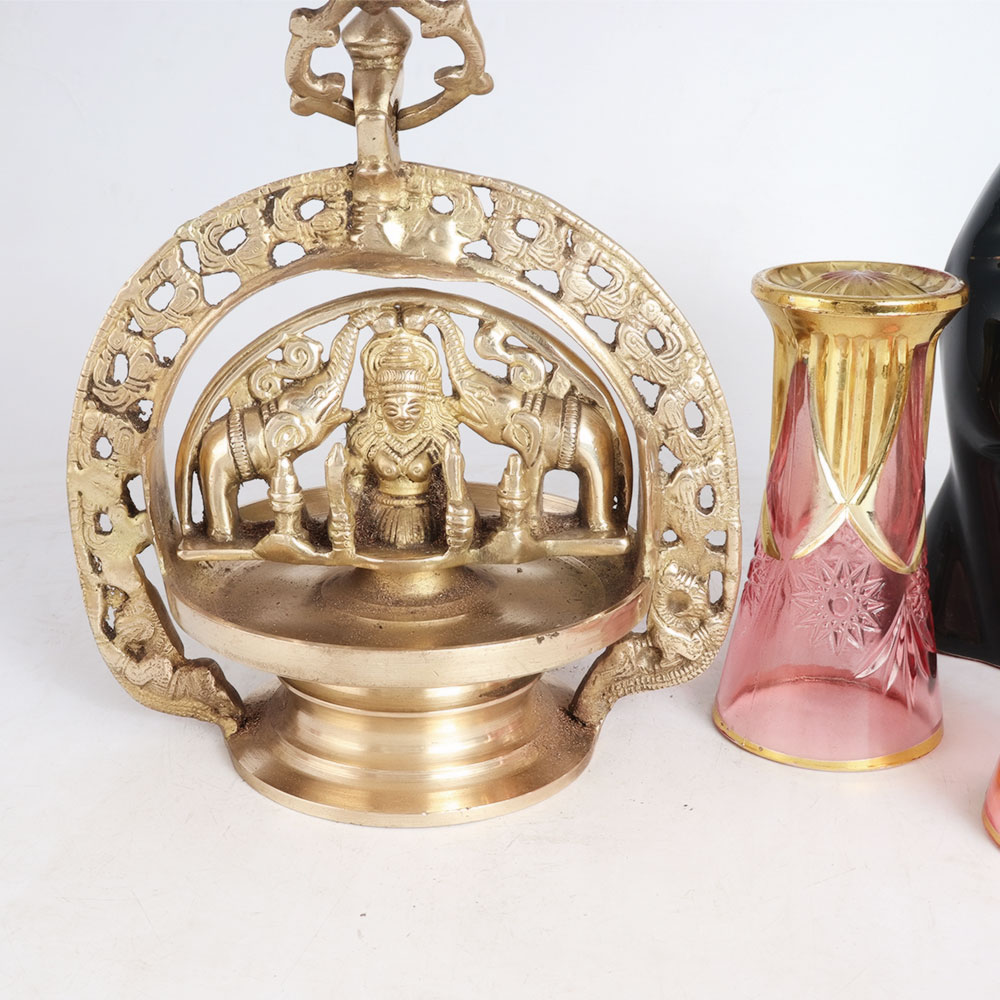 Gajalakshmi, also known as Gajalaxmi, is one of the most important Ashtalakshmi aspects of Goddess Lakshmi. She is worshipped in many temples in India and it is believed that keeping her statue will improve the inflow of money, reduce losses and improve the financial situation. Buy this brass oil lamp carved with goddess Gajalaxmi in golden finish. Hang this auspicious oil lamp in your prayer room at home, office, hotel or restaurant and use it during morning and evening prayers with mustard oil or desi ghee and a cotton wick. An auspicious oil lamp to give to your loved ones for initiation, celebration, anniversary, birthday, wedding or any special occasion.