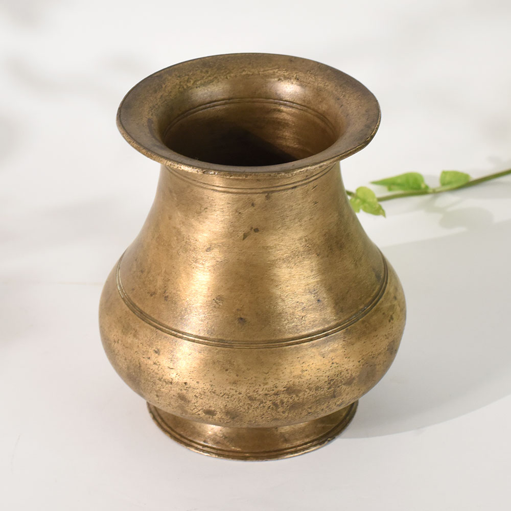 This Vintage Brass Holy Water Pot Handmade in South India is an authentic traditional vessel crafted by skilled artisans who specialize in age old metalwork. Its rounded silhouette, flared rim, and natural aged patina give it a timeless appeal that beautifully blends spirituality with vintage decor styling. Traditionally used for storing holy water during Hindu pooja rituals, this brass pot carries deep cultural value and symbolizes purity and devotion. The smooth contours and balanced shape reflect precise handwork that has been passed down through generations. Its rustic texture enhances its collectible charm, making it a meaningful addition to home temples, meditation corners, heritage decor setups, and spiritual gifting. Perfect for decorators, ritual practitioners, collectors, and wholesalers sourcing artisanal brassware, this pot adds warmth and authenticity to any space. Durable, elegant, and rich in heritage, it stands as a true representation of South Indian craftsmanship.