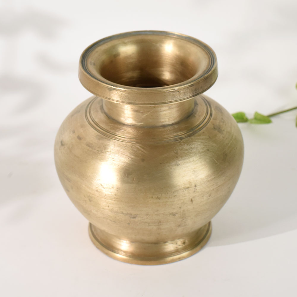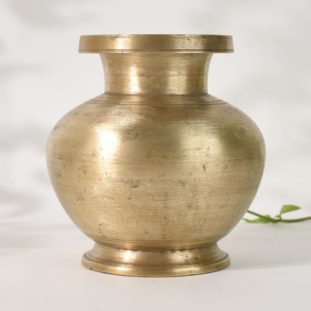 This vintage brass holy water pot is a timeless example of traditional South Indian metalcraft, handcrafted by skilled artisans using age-old techniques. Made from solid, high-quality brass, the pot features a rounded belly, narrow neck, and flared rim, offering an elegant silhouette that reflects the regions cultural heritage. Its naturally aged patina and hand-finished surface give it an authentic antique character, making it ideal for collectors, spiritual practitioners, and dcor enthusiasts. Traditionally used to store and pour holy water during Hindu rituals, this brass kalash also serves beautifully as a decorative accent for homes, temples, or meditation spaces. Whether displayed as a standalone art piece or incorporated into a spiritual altar, it adds a touch of heritage and serenity to any setting. Durable, sustainable, and rich in symbolism, this handmade pot reflects purity, prosperity, and sacred tradition.