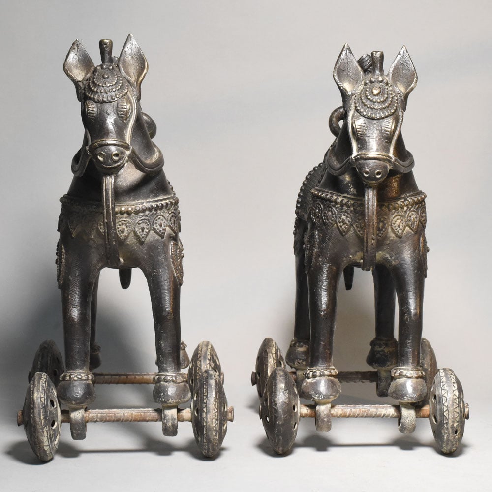 This pair of vintage brass horse rider rolling toy figurines reflects a traditional style of Indian folk metal craft where sculpture and movement come together in a playful mechanical form. Each figurine features a rider seated on a decorated horse, mounted on small rolling wheels that allow the piece to move across a surface. The horses are crafted with stylized proportions and adorned with engraved saddle cloth patterns, ornamental harness detailing, and small decorative motifs across the body. The riders wear traditional headgear and sit upright in a poised posture, suggesting scenes inspired by historical cavalry figures or village storytelling traditions. Mounted beneath the legs of each horse is a simple wheel mechanism made from metal axles and circular patterned wheels. This rolling structure gives the figurines their identity as traditional mechanical toys, once commonly handcrafted by rural artisans for both play and display. The brass surface shows a naturally aged patina with darker tones and subtle highlights that emphasize the sculpted textures and engraved patterns. This aged finish enhances the vintage character of the figures while revealing the hand-worked craftsmanship of the metal. Perfect for collectors of folk art toys, antique dcor enthusiasts, or lovers of traditional Indian metal artifacts, this horse rider pair offers both cultural charm and decorative appeal.