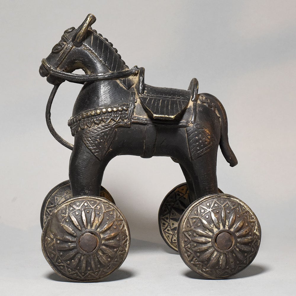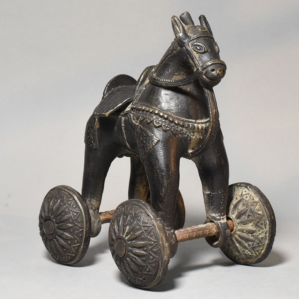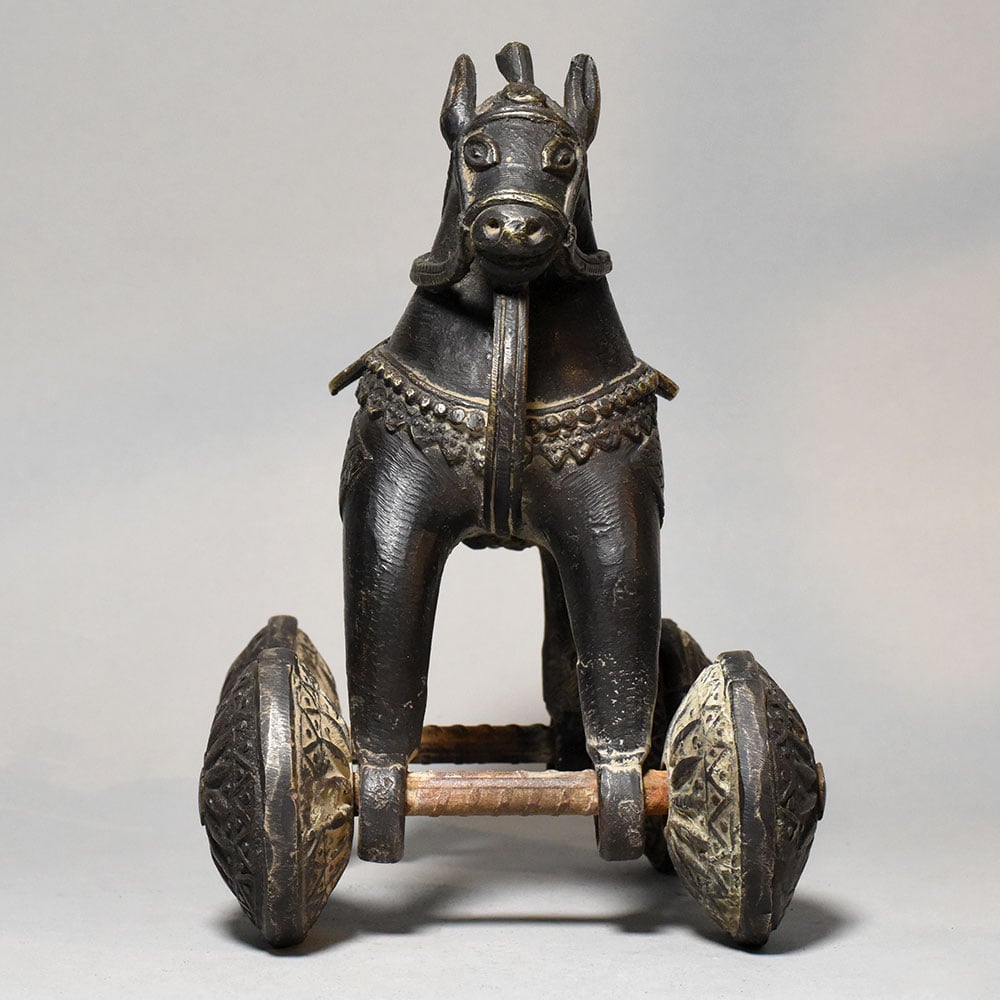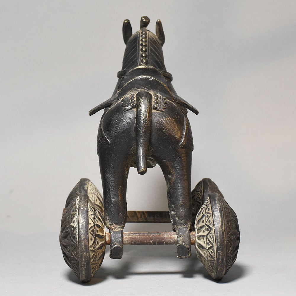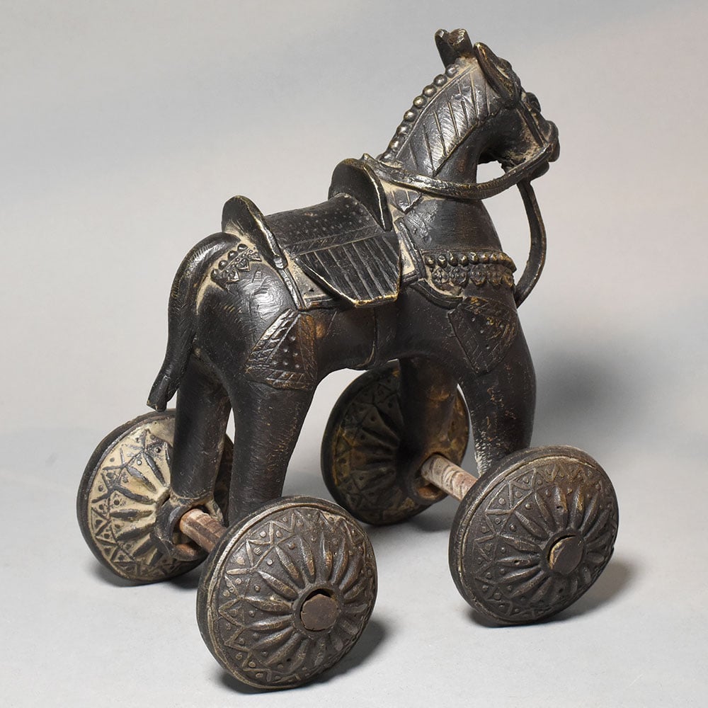 This vintage brass horse rolling toy figurine is a distinctive example of traditional Indian folk craftsmanship. The piece features a stylized horse figure mounted on four metal wheels, combining sculptural artistry with a playful mechanical element. The horse is designed with simple yet expressive details, including a carved harness, decorative saddle, and stylized facial features. The upright posture and elongated legs give the figurine a strong and balanced form, reflecting the artistic simplicity often found in traditional handcrafted metal toys. Mounted beneath the horse are four round brass wheels connected by metal axles, allowing the figurine to roll smoothly when pushed across a surface. Objects like these were historically created as traditional rolling toys and decorative collectibles, often representing animals that symbolized strength, speed, and movement. The brass surface displays a dark antique patina with natural wear and highlights that emphasize the sculptural details and textured patterns on the wheels. These aged tonal variations enhance the vintage character of the figurine. Ideal for collectors of traditional artifacts, vintage decor enthusiasts, or heritage-themed interiors, this brass rolling horse figurine adds a unique cultural element to display shelves, desks, or curio cabinets.