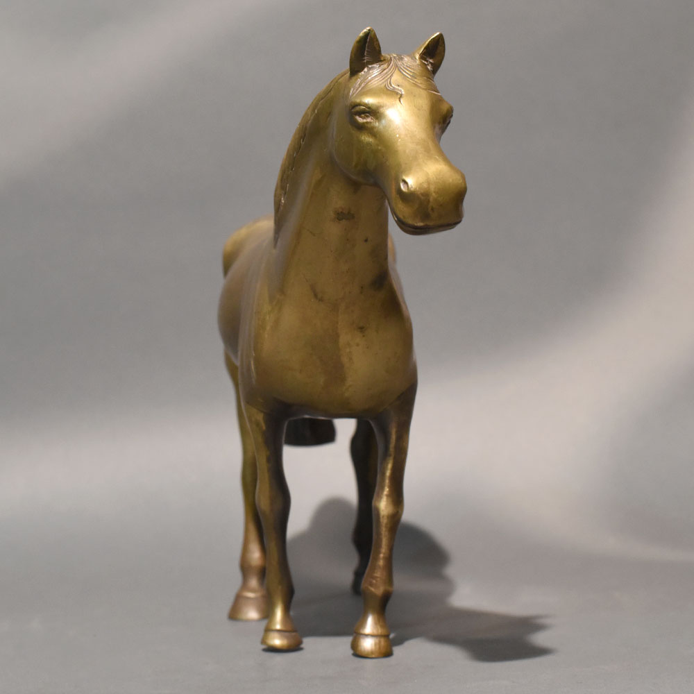 This vintage brass horse sculpture handcrafted in solid metal captures elegance, strength, and graceful movement in a refined decorative form. Designed in a standing posture with a slightly inclined head and defined muscular contours, the figure reflects balance and poised energy. The smooth body lines and minimal detailing give it a clean, timeless aesthetic suitable for both modern and classic interiors. The sculpture features a warm antique brass finish with subtle tonal shading across the legs and tail, enhancing depth and character. The gently carved mane and defined facial features add realism while maintaining a streamlined artistic interpretation. Its elongated proportions and stable stance make it ideal for display on console tables, office desks, bookshelves, or curated collectible arrangements. Horses are traditionally associated with power, freedom, and forward momentum. In decorative symbolism, they often represent success, ambition, and vitality. This handcrafted brass horse figurine can serve as an inspiring accent in workspaces or as a refined statement piece in living areas. Crafted using traditional casting techniques, the solid brass structure ensures durability and long-lasting appeal. Natural variations in finish highlight its artisanal authenticity, making each piece subtly unique.