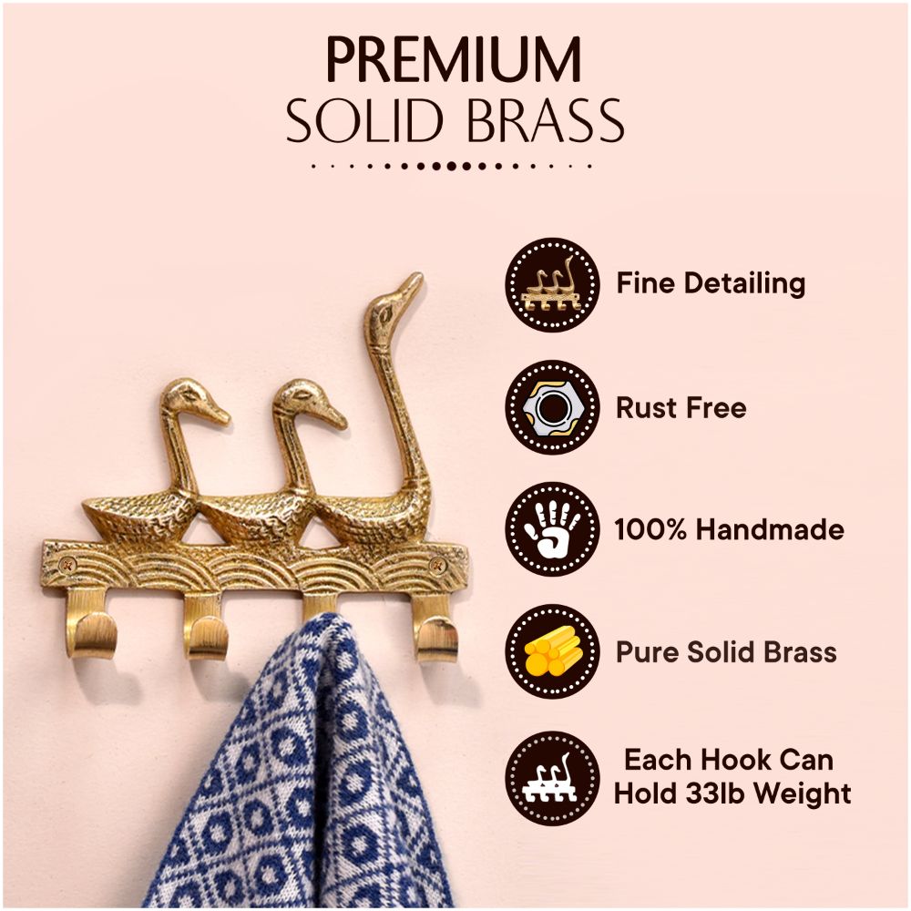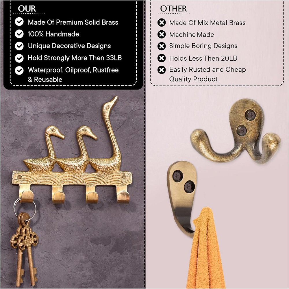 The Vintage Brass Key Holder for 4 Keys – 3 Ducks Design is more than just a key rack—it's a decorative statement that blends function with timeless charm. Made from solid brass and featuring three beautifully sculpted ducks in mid-stride, this key holder brings warmth, personality, and order to your walls. Whether you're decorating a rustic entryway or want a practical piece that doubles as art, this handcrafted brass key hook delivers both style and utility in one.