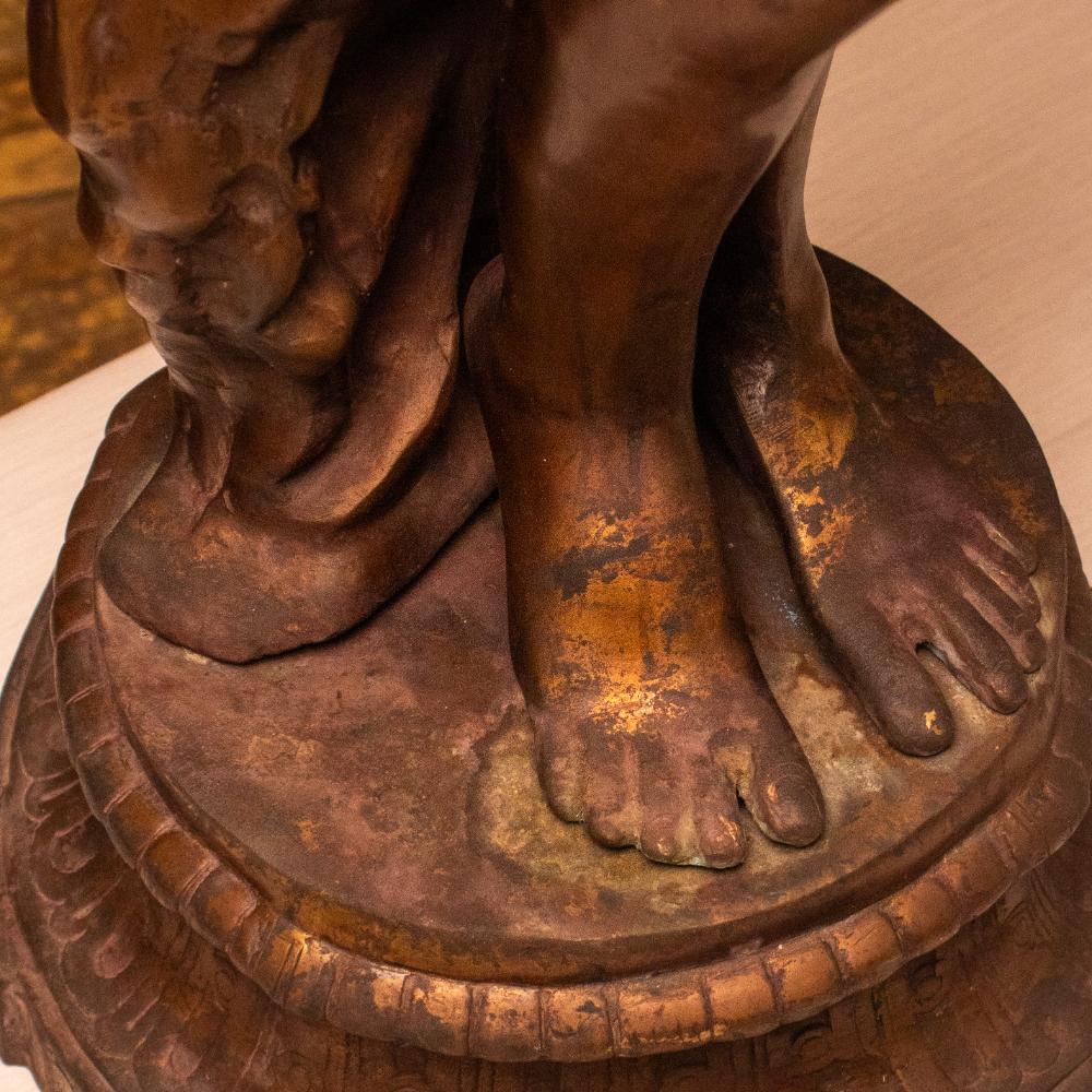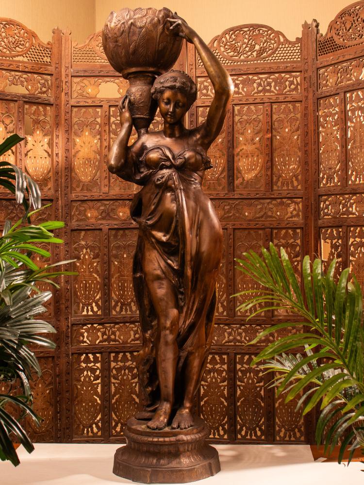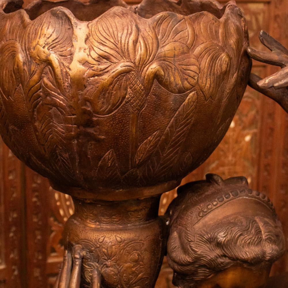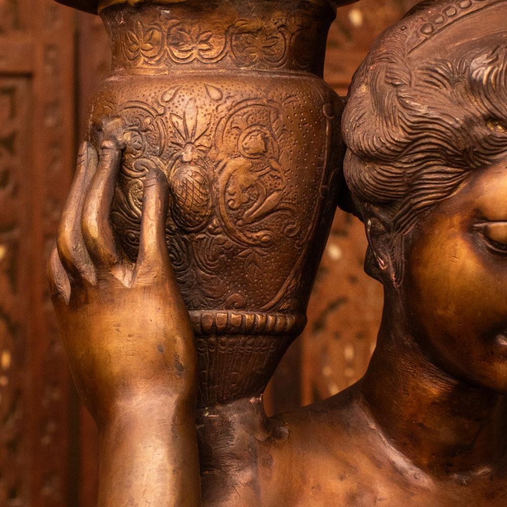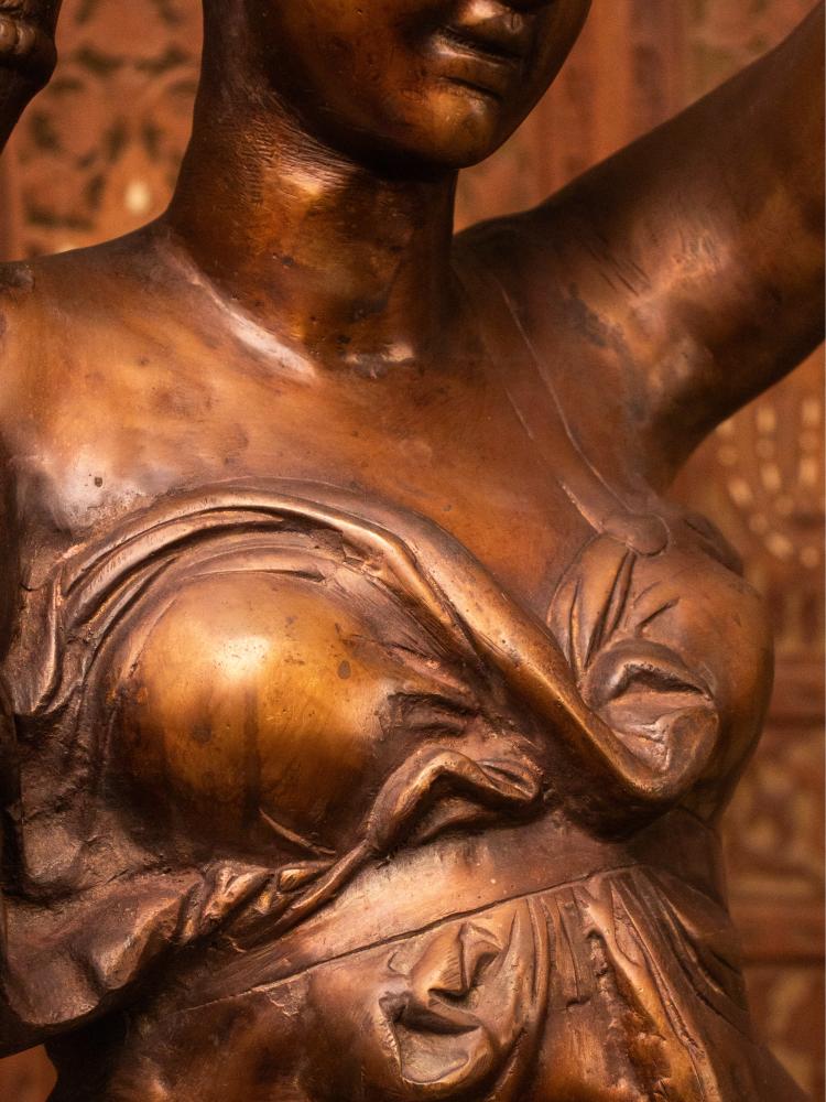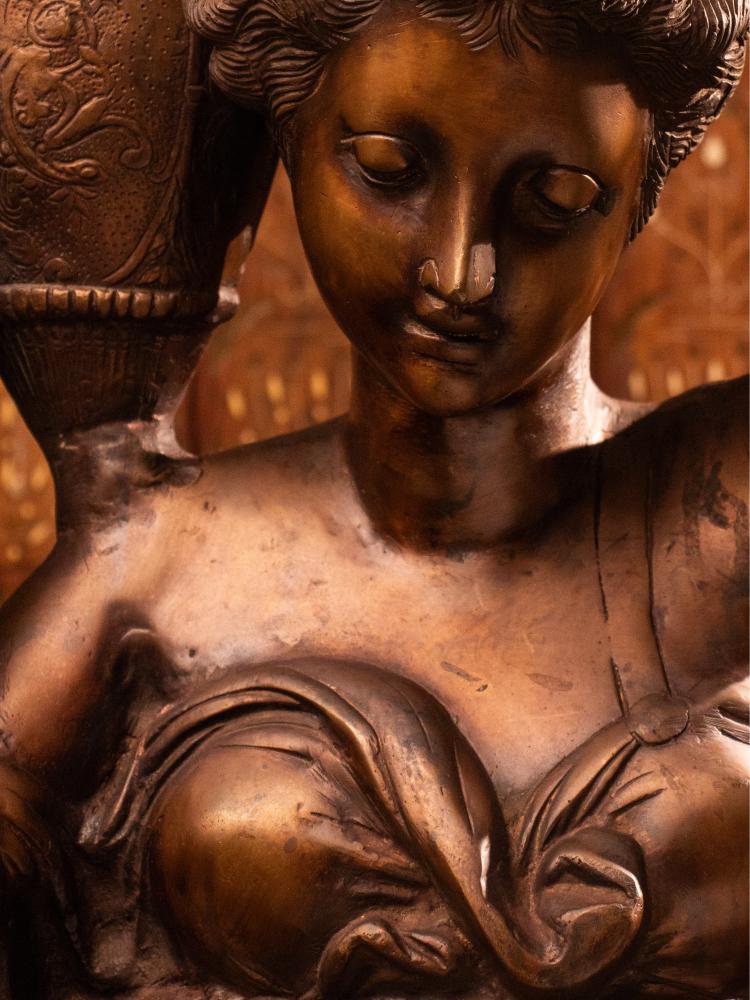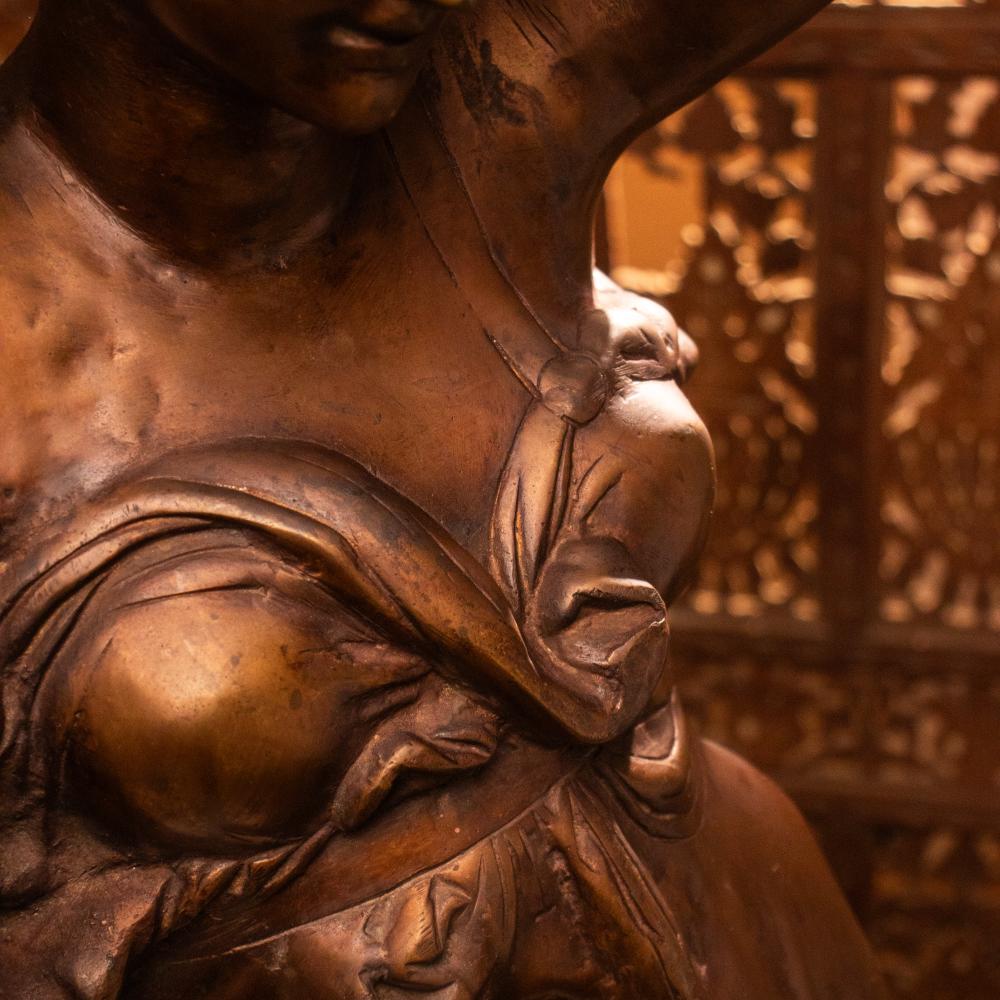 Celebrate timeless artistry with this Vintage Brass Lady Figurine with Floral Bowl, a graceful depiction of movement and femininity frozen in gleaming metal. The flowing lines of her skirt and the delicate bend of her arms capture a fluidity that feels both poised and full of life. Made of solid brass, this piece has acquired a natural patina over time, lending it a distinguished, aged charm. Whether placed in a study, library, or living room, it brings a touch of old-world refinement to any space.