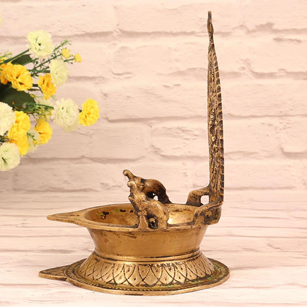 Enhance your sacred moments with the enchanting presence of our Vintage Brass Laxmi Ganesha Oil Lamp that is a masterpiece handmade by skilled Indian artisans in the time-honoured tradition of South Indian Art. Fashioned from high-quality brass, this exquisite piece seamlessly blends spirituality with artistic finesse. Adorned with intricate carvings of two majestic elephants on either side, symbolizing strength and wisdom, the lamp radiates a timeless charm. The antique brown finish adds a touch of nostalgia, enhancing its vintage appeal. Designed for prayer, this lamp serves as a divine centerpiece for your home, office, restaurant, hotel, or cafe prayer room. Immerse yourself in the warm glow of tradition as you light the lamp, invoking the blessings of Laxmi and Ganesha. Its versatile charm extends beyond religious spaces, making it a captivating addition to any vintage collection. Thoughtful and meaningful, this handmade treasure also makes for a perfect gift for your family, friends or relatives on special, festive, or auspicious occasions, conveying both artistry and spirituality in a single, timeless creation.