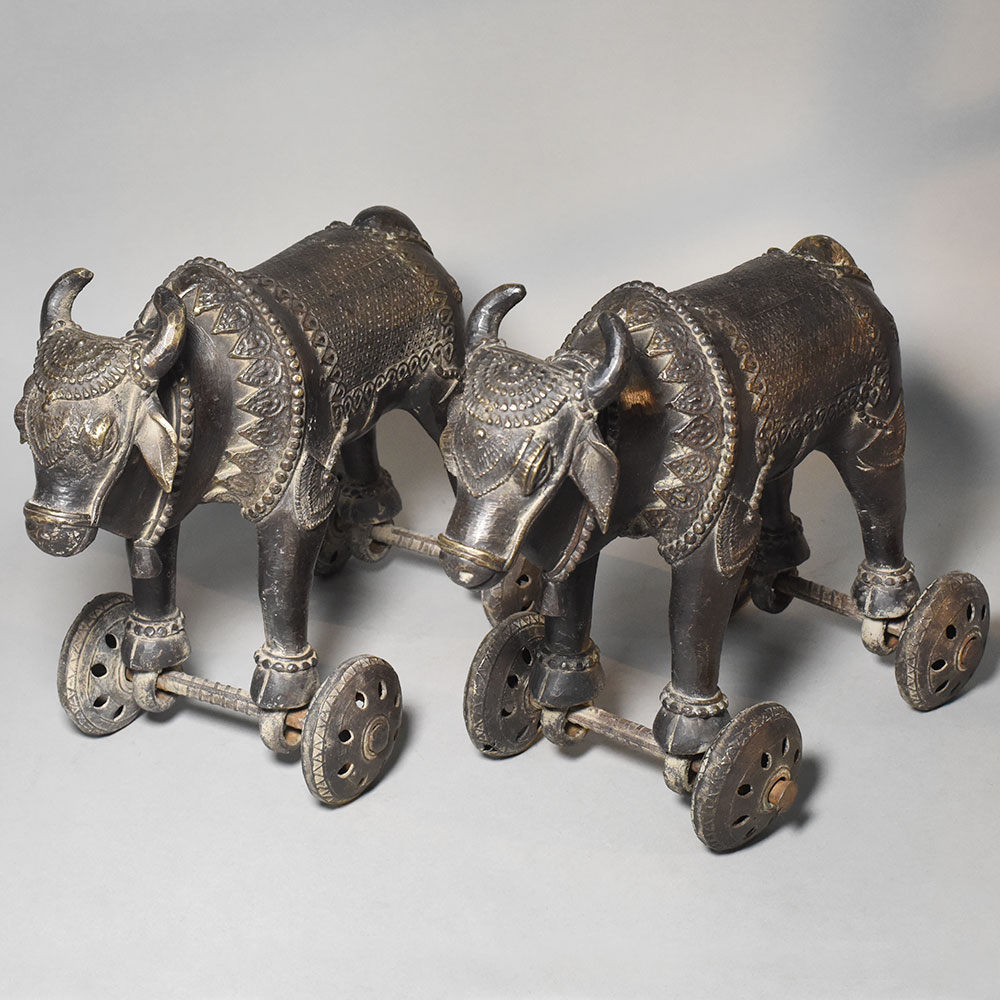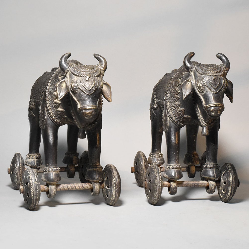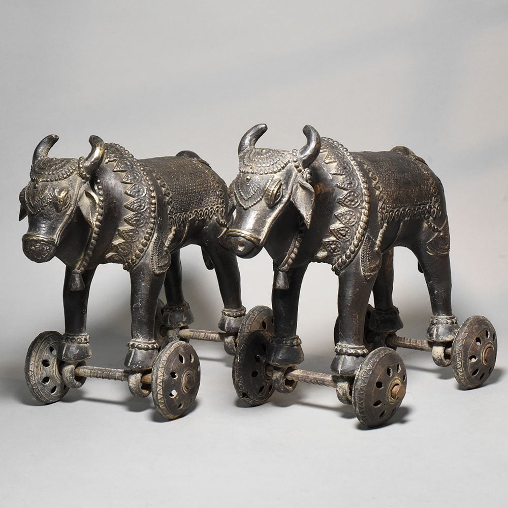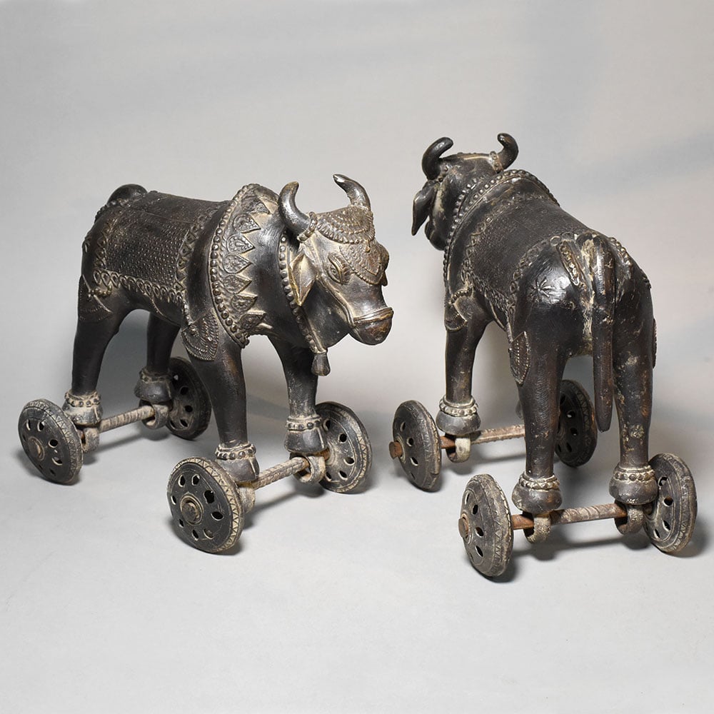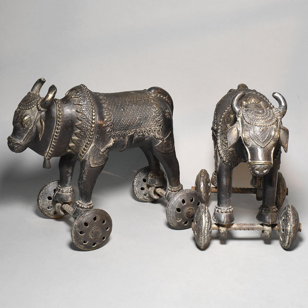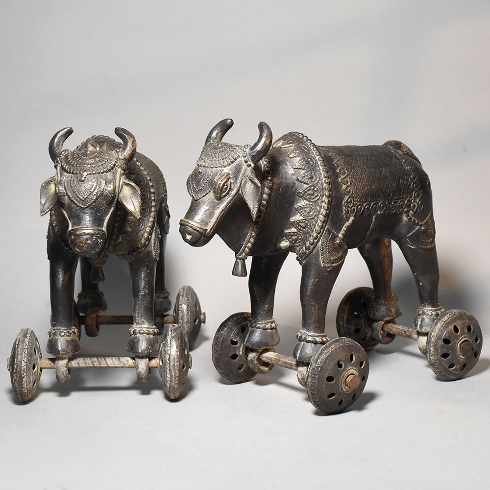 This vintage brass ox cart toy figurine pair captures the charm of traditional rural craftsmanship in miniature form. Each sculpture represents a stylized ox standing upright on four functional wheels, reflecting the design of early handcrafted rolling toys once found in village markets and artisan workshops. The oxen are decorated with engraved saddle cloth patterns, ornamental collars, and textured body detailing that suggest ceremonial animal adornment used in traditional Indian festivities and agricultural life. The curved horns and slightly forward stance give the figures a lively presence while maintaining a simple folk-art aesthetic. Each figurine is mounted on a small wheeled base constructed with metal axles and round patterned wheels. This rolling mechanism allows the pieces to move smoothly across a surface, reinforcing their identity as handcrafted mechanical toys rather than purely static sculptures. The brass body shows a dark aged finish with natural wear marks that enhance the authenticity of the object. Subtle highlights along the engraved surfaces reveal the underlying metal tone and bring attention to the hand-worked details. These ox rolling figures work beautifully as folk art collectibles, heritage dcor objects, or antique toy displays, especially for collectors interested in traditional Indian metal craft and village toy-making traditions.