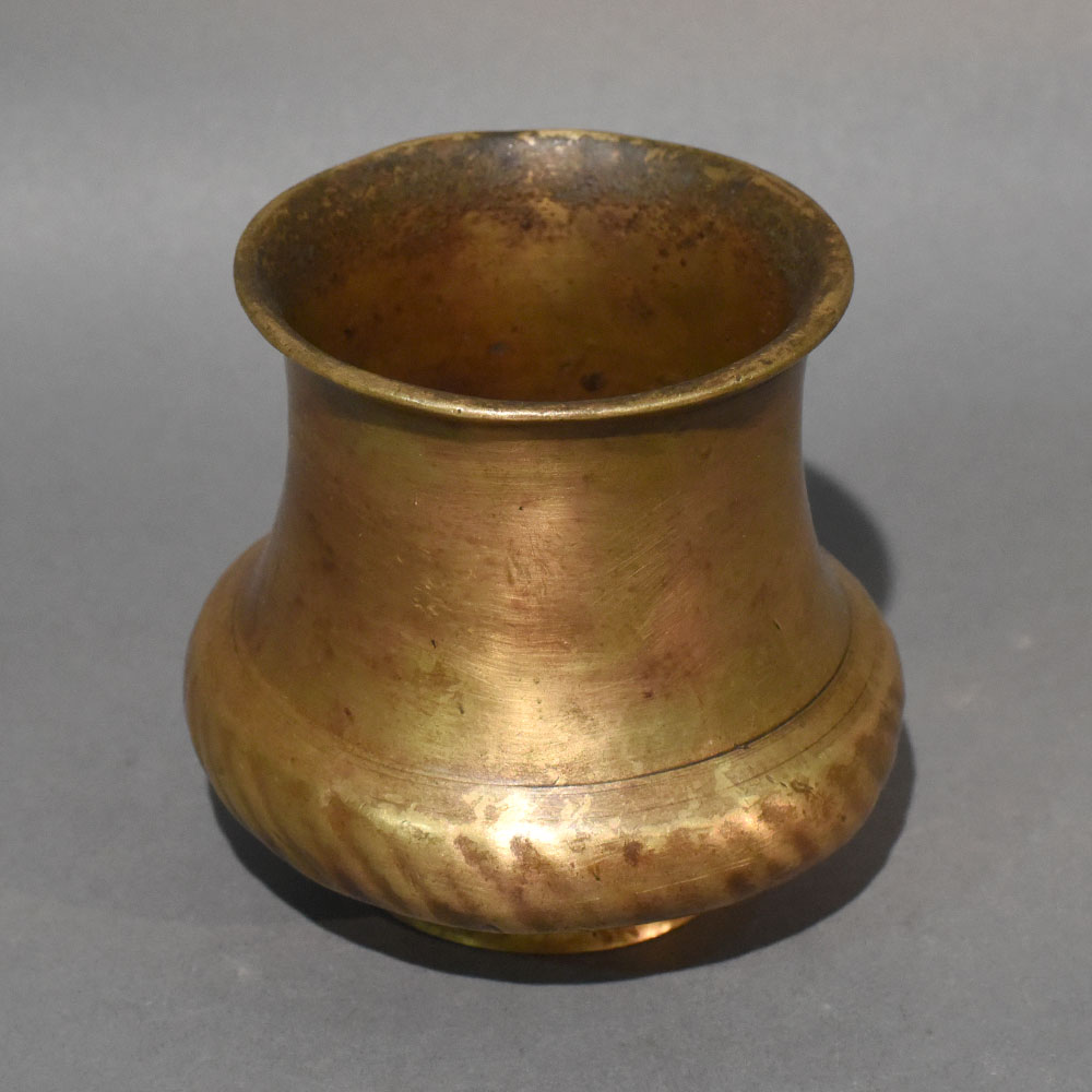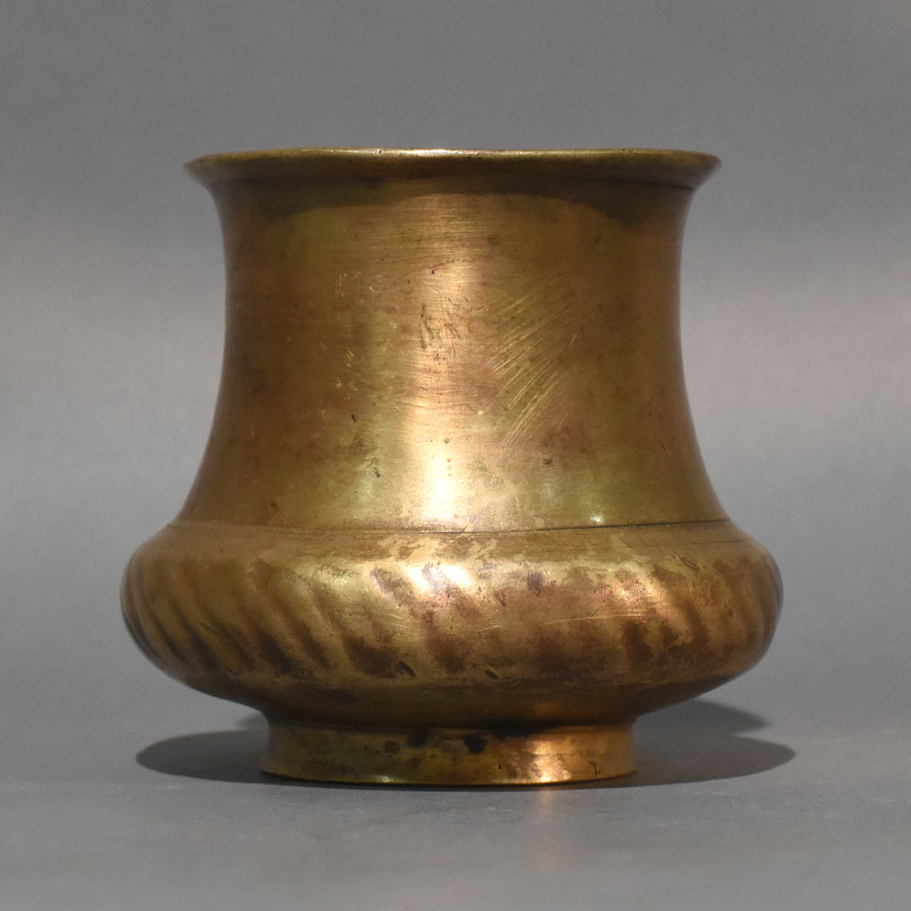 This vintage brass pooja lota sacred vessel is shaped in a traditional rounded profile that reflects devotional simplicity and enduring metal craftsmanship. Featuring a gently flared mouth, a narrowed neck, and a full curved lower body, the vessel rests securely on a compact circular base. Its balanced silhouette embodies ritual purity and classic temple-inspired design. The lower section displays a softly textured, hand-worked band that adds depth and character to the otherwise smooth brass surface. Natural patina, tonal variations, and subtle aging marks enhance its authentic antique appeal. The warm golden hue of solid brass deepens gradually over time, reinforcing its heritage value. Traditionally used for holding sacred water during rituals and temple ceremonies, the brass lota plays an important role in pooja practices. It can be used for abhishek rituals, offering water to deities, or as part of altar arrangements during festivals and religious gatherings. The wide opening allows convenient filling and pouring, while the rounded body ensures comfortable handling. Crafted from solid brass using traditional shaping techniques, this vessel is built for durability and long-term use. Each piece carries slight surface variations that highlight its handcrafted individuality without compromising strength or functionality.